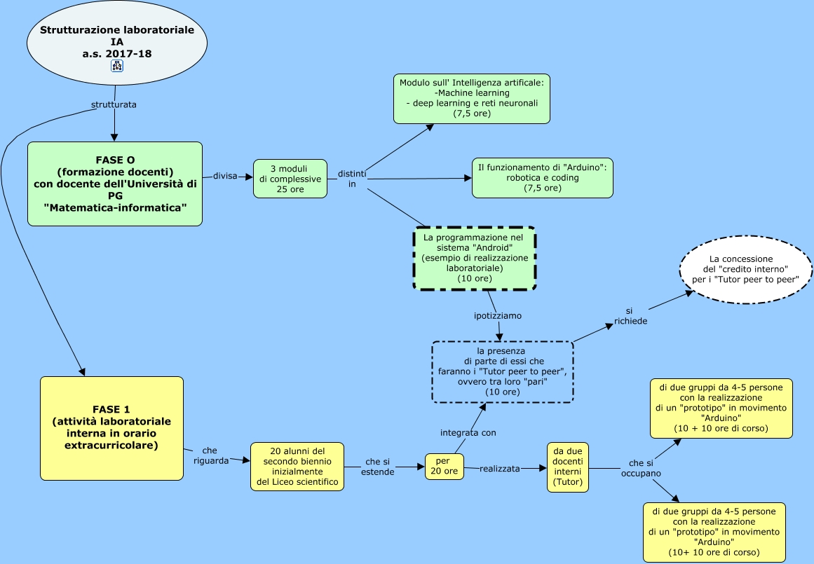 Questa Cmap, creata con IHMC CmapTools, contiene informazioni relative a: strutturazione laboratoriale, la presenza di parte di essi che faranno i "Tutor peer to peer", ovvero tra loro "pari" (10 ore) si richiede La concessione del "credito interno" per i "Tutor peer to peer", per 20 ore integrata con la presenza di parte di essi che faranno i "Tutor peer to peer", ovvero tra loro "pari" (10 ore), FASE 1 (attività laboratoriale interna in orario extracurricolare) che riguarda 20 alunni del secondo biennio inizialmente del Liceo scientifico, per 20 ore realizzata da due docenti interni (Tutor), da due docenti interni (Tutor) che si occupano di due gruppi da 4-5 persone con la realizzazione di un "prototipo" in movimento "Arduino" (10+ 10 ore di corso), FASE O (formazione docenti) con docente dell'Università di PG "Matematica-informatica" divisa 3 moduli di complessive 25 ore, La programmazione nel sistema "Android" (esempio di realizzazione laboratoriale) (10 ore) ipotizziamo la presenza di parte di essi che faranno i "Tutor peer to peer", ovvero tra loro "pari" (10 ore), 3 moduli di complessive 25 ore distinti in Modulo sull' Intelligenza artificale: -Machine learning - deep learning e reti neuronali (7,5 ore), Strutturazione laboratoriale IA a.s. 2017-18 strutturata FASE O (formazione docenti) con docente dell'Università di PG "Matematica-informatica", da due docenti interni (Tutor) che si occupano di due gruppi da 4-5 persone con la realizzazione di un "prototipo" in movimento "Arduino" (10 + 10 ore di corso), 3 moduli di complessive 25 ore distinti in Il funzionamento di "Arduino": robotica e coding (7,5 ore), 20 alunni del secondo biennio inizialmente del Liceo scientifico che si estende per 20 ore, Strutturazione laboratoriale IA a.s. 2017-18 strutturata FASE 1 (attività laboratoriale interna in orario extracurricolare), 3 moduli di complessive 25 ore distinti in La programmazione nel sistema "Android" (esempio di realizzazione laboratoriale) (10 ore)
