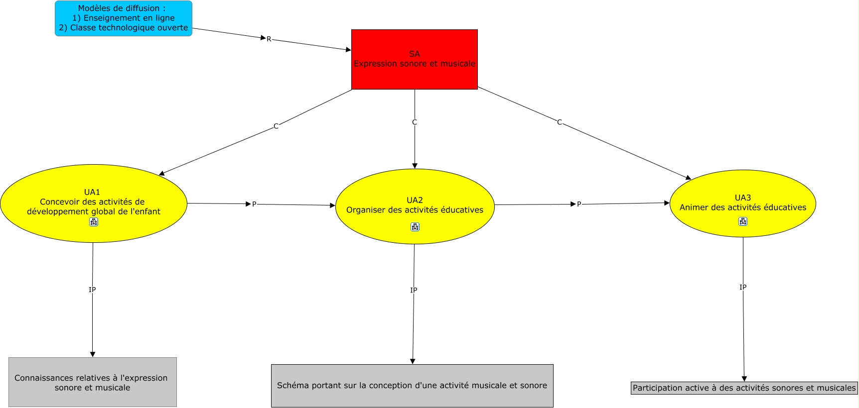 Cette carte de concepts créée avec IHMC CmapTools traite de: Kellie-TIC811, UA2 Organiser des activités éducatives P UA3 Animer des activités éducatives, SA Expression sonore et musicale C UA1 Concevoir des activités de développement global de l'enfant, UA1 Concevoir des activités de développement global de l'enfant IP Connaissances relatives à l'expression sonore et musicale, SA Expression sonore et musicale C UA2 Organiser des activités éducatives, UA3 Animer des activités éducatives IP Participation active à des activités sonores et musicales, SA Expression sonore et musicale C UA3 Animer des activités éducatives, UA1 Concevoir des activités de développement global de l'enfant P UA2 Organiser des activités éducatives, Modèles de diffusion : 1) Enseignement en ligne 2) Classe technologique ouverte R SA Expression sonore et musicale, UA2 Organiser des activités éducatives IP Schéma portant sur la conception d'une activité musicale et sonore