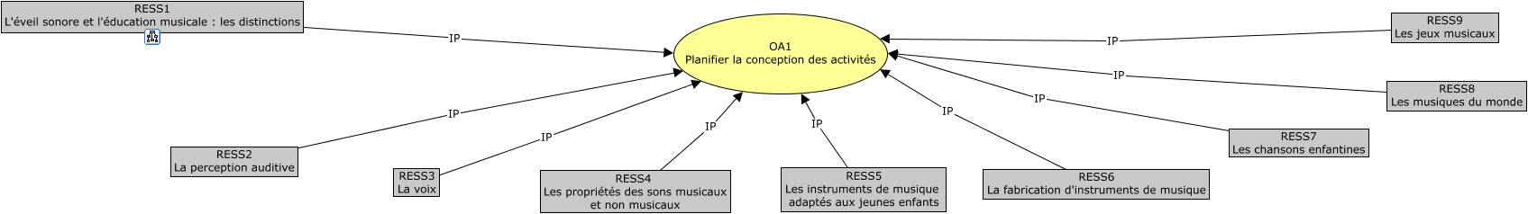 Cette carte de concepts créée avec IHMC CmapTools traite de: OA1, RESS7 Les chansons enfantines IP OA1 Planifier la conception des activités, RESS8 Les musiques du monde IP OA1 Planifier la conception des activités, RESS5 Les instruments de musique adaptés aux jeunes enfants IP OA1 Planifier la conception des activités, RESS1 L'éveil sonore et l'éducation musicale : les distinctions IP OA1 Planifier la conception des activités, RESS3 La voix IP OA1 Planifier la conception des activités, RESS2 La perception auditive IP OA1 Planifier la conception des activités, RESS6 La fabrication d'instruments de musique IP OA1 Planifier la conception des activités, RESS9 Les jeux musicaux IP OA1 Planifier la conception des activités, RESS4 Les propriétés des sons musicaux et non musicaux IP OA1 Planifier la conception des activités