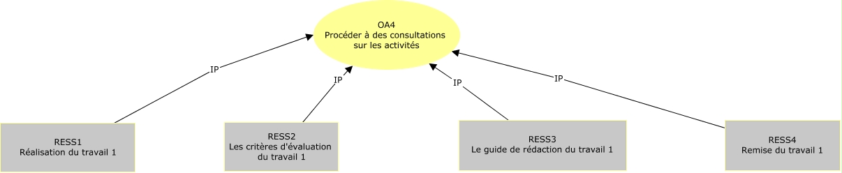 Cette carte de concepts créée avec IHMC CmapTools traite de: OA4, RESS4 Remise du travail 1 IP OA4 Procéder à des consultations sur les activités, RESS2 Les critères d'évaluation du travail 1 IP OA4 Procéder à des consultations sur les activités, RESS3 Le guide de rédaction du travail 1 IP OA4 Procéder à des consultations sur les activités, RESS1 Réalisation du travail 1 IP OA4 Procéder à des consultations sur les activités