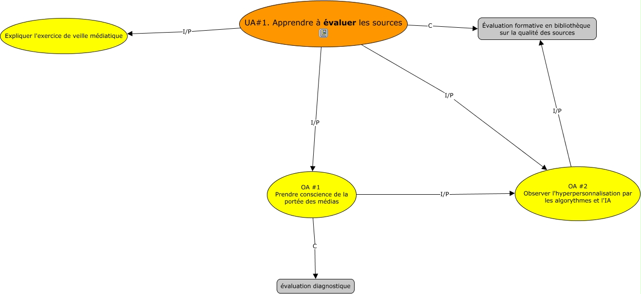 This Concept Map, created with IHMC CmapTools, has information related to: UA1, UA#1. Apprendre à évaluer les sources I/P OA #2 Observer l'hyperpersonnalisation par les algorythmes et l'IA, UA#1. Apprendre à évaluer les sources C Évaluation formative en bibliothèque sur la qualité des sources, UA#1. Apprendre à évaluer les sources I/P Expliquer l'exercice de veille médiatique, OA #2 Observer l'hyperpersonnalisation par les algorythmes et l'IA I/P Évaluation formative en bibliothèque sur la qualité des sources, OA #1 Prendre conscience de la portée des médias I/P OA #2 Observer l'hyperpersonnalisation par les algorythmes et l'IA, OA #1 Prendre conscience de la portée des médias C évaluation diagnostique, UA#1. Apprendre à évaluer les sources I/P OA #1 Prendre conscience de la portée des médias