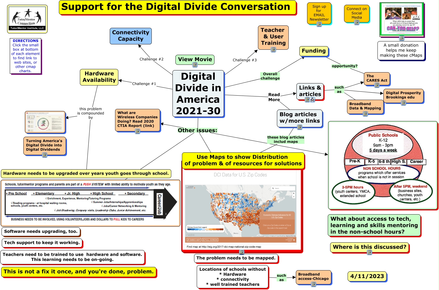 This Concept Map, created with IHMC CmapTools, has information related to: DigitalDivide-2017 and beyond, ???? Use Maps to show Distribution of problem & of resources for solutions, Blog articles w/more links these blog articles includ maps Use Maps to show Distribution of problem & of resources for solutions, Hardware Availability this problem is compounded by, Digital Divide in America 2021-30 Challenge #3 Teacher & User Training, Digital Divide in America 2021-30 Other issues:, Links & articles such as The CARES Act, Hardware Availability this problem is compounded by Hardware needs to be upgraded over years youth goes through school., Digital Divide in America 2021-30 Read More Blog articles w/more links, Locations of schools without * Hardware * connectivity * well trained teachers such as Broadband access-Chicago, Digital Divide in America 2021-30 Challenge #2 Connectivity Capacity, Digital Divide in America 2021-30 Other issues: What are Wireless Companies Doing? Read 2020 CTIA Report (link), Funding opportunity? The CARES Act, Digital Divide in America 2021-30 Other issues:, Digital Divide in America 2021-30 Read More Links & articles, Digital Divide in America 2021-30 Challenge #1 Hardware Availability, Links & articles such as Broadband Data & Mapping, Digital Divide in America 2021-30 Other issues:, Links & articles such as Digital Prosperity Brookings edu, Digital Divide in America 2021-30 Overall challenge Funding