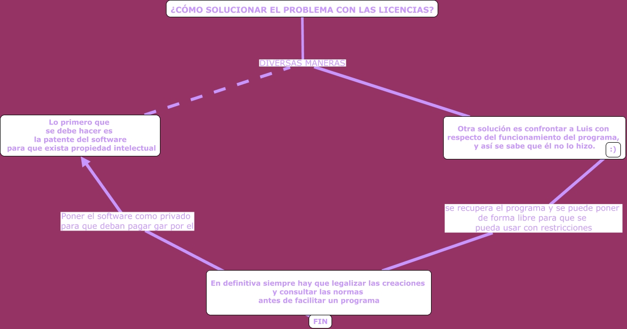 Este Cmap, tiene información relacionada con: Sin Título 2, :) se recupera el programa y se puede poner de forma libre para que se pueda usar con restricciones En definitiva siempre hay que legalizar las creaciones y consultar las normas antes de facilitar un programa, ¿CÓMO SOLUCIONAR EL PROBLEMA CON LAS LICENCIAS? DIVERSAS MANERAS Otra solución es confrontar a Luis con respecto del funcionamiento del programa, y así se sabe que él no lo hizo., FIN Poner el software como privado para que deban pagar gar por el Lo primero que se debe hacer es la patente del software para que exista propiedad intelectual, Lo primero que se debe hacer es la patente del software para que exista propiedad intelectual DIVERSAS MANERAS Otra solución es confrontar a Luis con respecto del funcionamiento del programa, y así se sabe que él no lo hizo.
