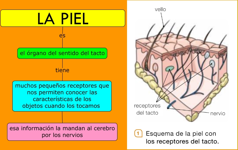 Este Cmap, tiene información relacionada con: La piel, muchos pequeños receptores que nos permiten conocer las características de los objetos cuando los tocamos esa información la mandan al cerebro por los nervios, el órgano del sentido del tacto tiene muchos pequeños receptores que nos permiten conocer las características de los objetos cuando los tocamos, LA PIEL es el órgano del sentido del tacto