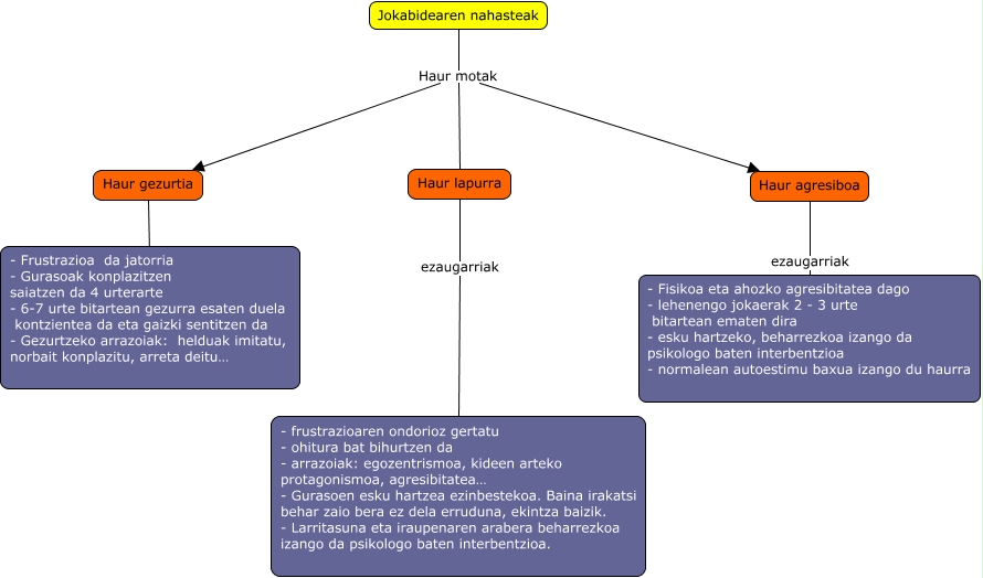 Este Cmap, tiene información relacionada con: jokabidearen nahasteak, Jokabidearen nahasteak Haur motak Haur lapurra, Haur lapurra ezaugarriak - frustrazioaren ondorioz gertatu - ohitura bat bihurtzen da - arrazoiak: egozentrismoa, kideen arteko protagonismoa, agresibitatea… - Gurasoen esku hartzea ezinbestekoa. Baina irakatsi behar zaio bera ez dela erruduna, ekintza baizik. - Larritasuna eta iraupenaren arabera beharrezkoa izango da psikologo baten interbentzioa., Jokabidearen nahasteak Haur motak Haur agresiboa, Jokabidearen nahasteak Haur motak Haur gezurtia, Haur agresiboa ezaugarriak - Fisikoa eta ahozko agresibitatea dago - lehenengo jokaerak 2 - 3 urte bitartean ematen dira - esku hartzeko, beharrezkoa izango da psikologo baten interbentzioa - normalean autoestimu baxua izango du haurra, Haur gezurtia ezaugarriak - Frustrazioa da jatorria - Gurasoak konplazitzen saiatzen da 4 urterarte - 6-7 urte bitartean gezurra esaten duela kontzientea da eta gaizki sentitzen da - Gezurtzeko arrazoiak: helduak imitatu, norbait konplazitu, arreta deitu…