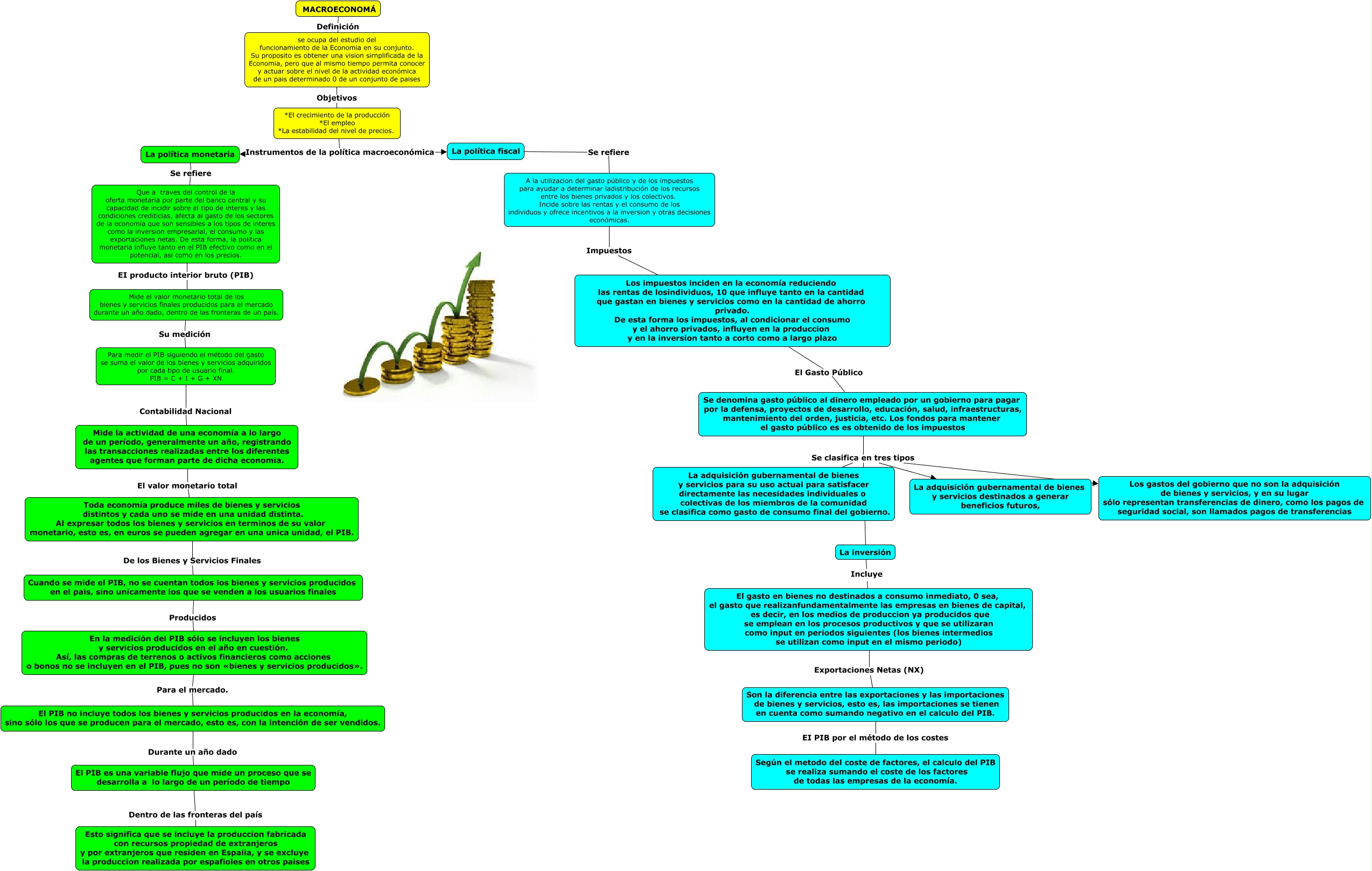 Este Cmap, tiene información relacionada con: PRINCIPIOS DE LA MACROECONÓMIA, El PIB no incluye todos los bienes y servicios producidos en la economía, sino sólo los que se producen para el mercado, esto es, con la intención de ser vendidos. Durante un año dado El PIB es una variable flujo que mide un proceso que se desarrolla a lo largo de un período de tiempo, El gasto en bienes no destinados a consumo inmediato, 0 sea, el gasto que realizanfundamentalmente las empresas en bienes de capital, es decir, en los medios de produccion ya producidos que se emplean en los procesos productivos y que se utilizaran como input en periodos siguientes (los bienes intermedios se utilizan como input en el mismo periodo) Exportaciones Netas (NX) Son la diferencia entre las exportaciones y las importaciones de bienes y servicios, esto es, las importaciones se tienen en cuenta como sumando negativo en el calculo del PIB., El PIB es una variable flujo que mide un proceso que se desarrolla a lo largo de un período de tiempo Dentro de las fronteras del país Esto significa que se incluye la produccion fabricada con recursos propiedad de extranjeros y por extranjeros que residen en Espaiia, y se excluye la produccion realizada por espafioles en otros paises, La política monetaria Se refiere Que a traves del control de la oferta monetaria por parte del banco central y su capacidad de incidir sobre el tipo de interes y las condiciones crediticias, afecta al gasto de los sectores de la economía que son sensibles a los tipos de interes como la inversion empresarial, el consumo y las exportaciones netas. De esta forma, la politica monetaria influye tanto en el PIB efectivo como en el potencial, asi como en los precios., se ocupa del estudio del funcionamiento de la Economia en su conjunto. Su proposito es obtener una vision sirnplificada de la Economia, pero que al mismo tiempo permita conocer y actuar sobre el nivel de la actividad económica de un pais determinado 0 de un conjunto de paises Objetivos *El crecimiento de la producción *El empleo *La estabilidad del nivel de precios., Se denomina gasto público al dinero empleado por un gobierno para pagar por la defensa, proyectos de desarrollo, educación, salud, infraestructuras, mantenimiento del orden, justicia, etc. Los fondos para mantener el gasto público es es obtenido de los impuestos Se clasifica en tres tipos La adquisición gubernamental de bienes y servicios destinados a generar beneficios futuros,, La política fiscal Se refiere A la utilizacion del gasto público y de los impuestos para ayudar a determinar ladistribución de los recursos entre los bienes privados y los colectivos. Incide sobre las rentas y el consumo de los individuos y ofrece incentivos a la inversion y otras decisiones económicas., Que a traves del control de la oferta monetaria por parte del banco central y su capacidad de incidir sobre el tipo de interes y las condiciones crediticias, afecta al gasto de los sectores de la economía que son sensibles a los tipos de interes como la inversion empresarial, el consumo y las exportaciones netas. De esta forma, la politica monetaria influye tanto en el PIB efectivo como en el potencial, asi como en los precios. EI producto interior bruto (PIB) Mide el valor monetario total de los bienes y servicios finales producidos para el mercado durante un año dado, dentro de las fronteras de un país., En la medición del PIB sólo se incluyen los bienes y servicios producidos en el año en cuestión. Así, las compras de terrenos o activos financieros como acciones o bonos no se incluyen en el PIB, pues no son «bienes y servicios producidos». Para el mercado. El PIB no incluye todos los bienes y servicios producidos en la economía, sino sólo los que se producen para el mercado, esto es, con la intención de ser vendidos., Para medir el PIB siguiendo el método del gasto se suma el valor de los bienes y servicios adquiridos por cada tipo de usuario final. PIB = C + I + G + XN Contabilidad Nacional Mide la actividad de una economía a lo largo de un período, generalmente un año, registrando las transacciones realizadas entre los diferentes agentes que forman parte de dicha economia., Se denomina gasto público al dinero empleado por un gobierno para pagar por la defensa, proyectos de desarrollo, educación, salud, infraestructuras, mantenimiento del orden, justicia, etc. Los fondos para mantener el gasto público es es obtenido de los impuestos Se clasifica en tres tipos Los gastos del gobierno que no son la adquisición de bienes y servicios, y en su lugar sólo representan transferencias de dinero, como los pagos de seguridad social, son llamados pagos de transferencias, Los impuestos inciden en la economía reduciendo las rentas de losindividuos, 10 que influye tanto en la cantidad que gastan en bienes y servicios como en la cantidad de ahorro privado. De esta forma los impuestos, al condicionar el consumo y el ahorro privados, influyen en la produccion y en la inversion tanto a corto como a largo plazo El Gasto Público Se denomina gasto público al dinero empleado por un gobierno para pagar por la defensa, proyectos de desarrollo, educación, salud, infraestructuras, mantenimiento del orden, justicia, etc. Los fondos para mantener el gasto público es es obtenido de los impuestos, MACROECONOMÁ Definición se ocupa del estudio del funcionamiento de la Economia en su conjunto. Su proposito es obtener una vision sirnplificada de la Economia, pero que al mismo tiempo permita conocer y actuar sobre el nivel de la actividad económica de un pais determinado 0 de un conjunto de paises, Son la diferencia entre las exportaciones y las importaciones de bienes y servicios, esto es, las importaciones se tienen en cuenta como sumando negativo en el calculo del PIB. EI PIB por el método de los costes Según el metodo del coste de factores, el calculo del PIB se realiza sumando el coste de los factores de todas las empresas de la econo