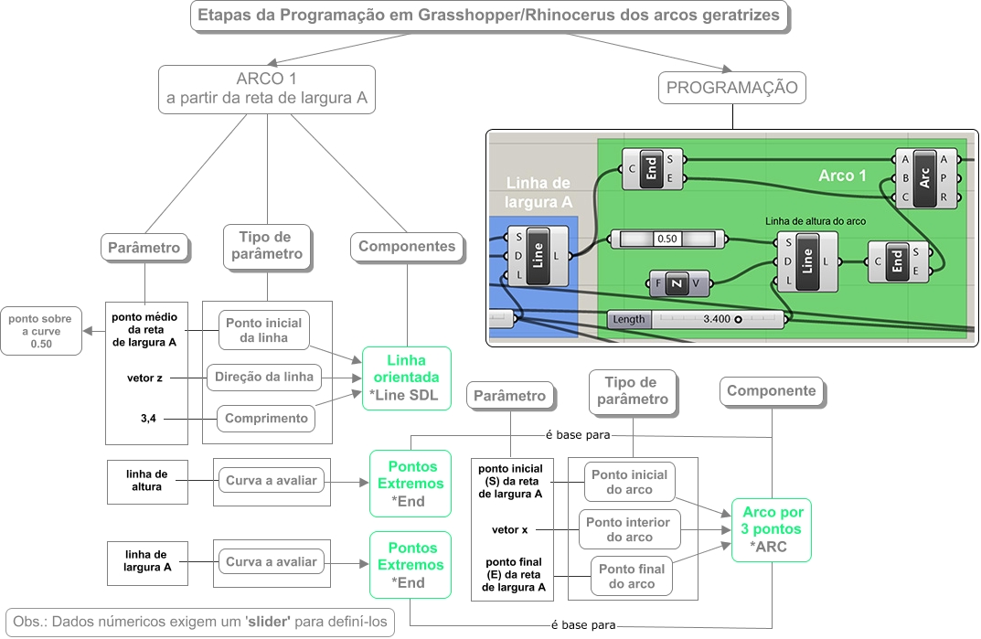 Esse mapa conceitual, produzido no IHMC CmapTools, tem a informação relacionada a: etapas_program_arco_geratriz_1, ARCO 1 a partir da reta de largura A Componentes, Ponto inicial do arco Arco por 3 pontos *ARC, Parâmetro ponto inicial (S) da reta de largura A, ponto final (E) da reta de largura A Ponto final do arco, ponto inicial (S) da reta de largura A Ponto inicial do arco, vetor z Direção da linha, Ponto final do arco Arco por 3 pontos *ARC, Pontos Extremos *End é base para Arco por 3 pontos *ARC, Tipo de parâmetro, 3,4 Comprimento, Curva a avaliar Pontos Extremos *End, ponto médio da reta de largura A Ponto inicial da linha, Direção da linha Linha orientada *Line SDL, PROGRAMAÇÃO, vetor x Ponto interior do arco, Parâmetro ponto médio da reta de largura A, ARCO 1 a partir da reta de largura A Tipo de parâmetro, Curva a avaliar Pontos Extremos *End, Componente Arco por 3 pontos *ARC, Etapas da Programação em Grasshopper/Rhinocerus dos arcos geratrizes PROGRAMAÇÃO