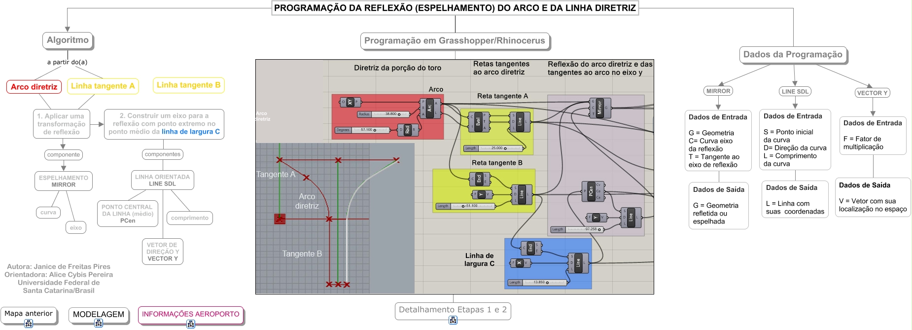 Esse mapa conceitual, produzido no IHMC CmapTools, tem a informação relacionada a: programação_espelhamento_arcos_linha_diretrizes_reformulado, Dados de Entrada F = Fator de multiplicação Dados de Saída V = Vetor com sua localização no espaço, Dados da Programação VECTOR Y Dados de Entrada F = Fator de multiplicação, Detalhamento Etapas 1 e 2, PROGRAMAÇÃO DA REFLEXÃO (ESPELHAMENTO) DO ARCO E DA LINHA DIRETRIZ Programação em Grasshopper/Rhinocerus, ESPELHAMENTO MIRROR curva, Programação em Grasshopper/Rhinocerus, Dados da Programação MIRROR Dados de Entrada G = Geometria C= Curva eixo da reflexão T = Tangente ao eixo de reflexão, Linha tangente A 1. Aplicar uma transformação de reflexão, LINHA ORIENTADA LINE SDL VETOR DE DIREÇÃO Y VECTOR Y, LINHA ORIENTADA LINE SDL comprimento, Dados da Programação LINE SDL Dados de Entrada S = Ponto inicial da curva D= Direção da curva L = Comprimento da curva, Arco diretriz 1. Aplicar uma transformação de reflexão, LINHA ORIENTADA LINE SDL PONTO CENTRAL DA LINHA (médio) PCen, PROGRAMAÇÃO DA REFLEXÃO (ESPELHAMENTO) DO ARCO E DA LINHA DIRETRIZ Algoritmo, PROGRAMAÇÃO DA REFLEXÃO (ESPELHAMENTO) DO ARCO E DA LINHA DIRETRIZ Dados da Programação, ESPELHAMENTO MIRROR eixo, Dados de Entrada S = Ponto inicial da curva D= Direção da curva L = Comprimento da curva Dados de Saída L = Linha com suas coordenadas, 2. Construir um eixo para a reflexão com ponto extremo no ponto médio da linha de largura C componentes LINHA ORIENTADA LINE SDL, 1. Aplicar uma transformação de reflexão 2. Construir um eixo para a reflexão com ponto extremo no ponto médio da linha de largura C, Algoritmo a partir do(a) Arco diretriz
