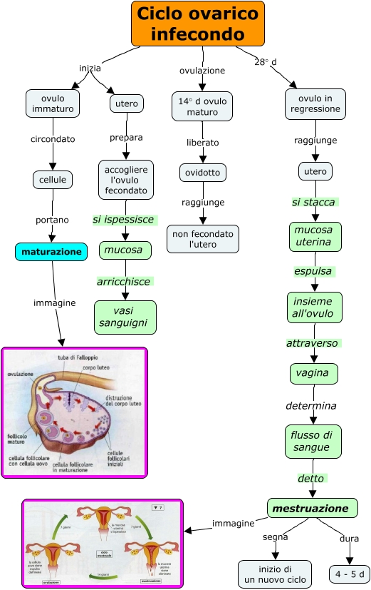 Questa Cmap, creata con IHMC CmapTools, contiene informazioni relative a: 13.6 ciclo ovarico infecondo, ovidotto raggiunge non fecondato l'utero, mestruazione segna inizio di un nuovo ciclo, insieme all'ovulo attraverso vagina, mucosa uterina espulsa insieme all'ovulo, Ciclo ovarico infecondo inizia utero, utero prepara accogliere l'ovulo fecondato, mestruazione dura 4 - 5 d, maturazione immagine, accogliere l'ovulo fecondato si ispessisce mucosa, utero si stacca mucosa uterina, ovulo immaturo circondato cellule, vagina determina flusso di sangue, Ciclo ovarico infecondo 28° d ovulo in regressione, ovulo in regressione raggiunge utero, flusso di sangue detto mestruazione, Ciclo ovarico infecondo ovulazione 14° d ovulo maturo, mestruazione immagine, cellule portano maturazione, mucosa arricchisce vasi sanguigni, Ciclo ovarico infecondo inizia ovulo immaturo