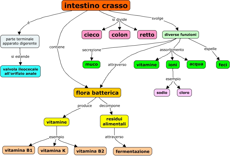 Questa Cmap, creata con IHMC CmapTools, contiene informazioni relative a: 15.13 Intestino Crasso, flora batterica produce vitamine, diverse funzioni assorbimento acqua, diverse funzioni assorbimento vitamine, vitamine esempio vitamina B2, ioni esempio cloro, intestino crasso si divide colon, intestino crasso si divide cieco, vitamine esempio vitamina B1, diverse funzioni attraverso flora batterica, intestino crasso contiene flora batterica, intestino crasso svolge diverse funzioni, diverse funzioni secrezione muco, parte terminale apparato digerente si estende valvola ileocecale all'orifizio anale, diverse funzioni assorbimento ioni, residui alimentali attraverso fermentazione, ioni esempio sodio, intestino crasso è parte terminale apparato digerente, flora batterica decompone residui alimentali, vitamine esempio vitamina K, diverse funzioni espelle feci