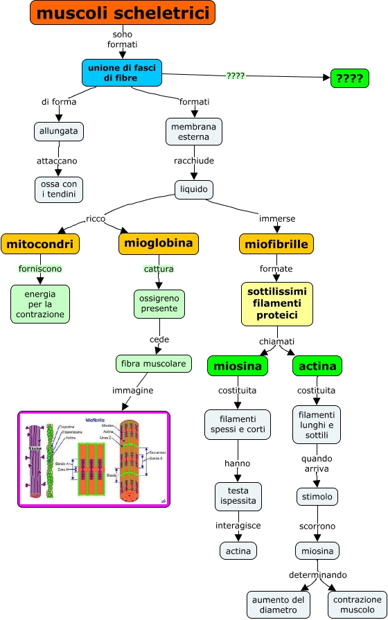 Questa Cmap, creata con IHMC CmapTools, contiene informazioni relative a: 13.05 Muscoli scheletrici, liquido immerse miofibrille, filamenti lunghi e sottili quando arriva stimolo, unione di fasci di fibre di forma allungata, miofibrille formate sottilissimi filamenti proteici, miosina determinando contrazione muscolo, miosina determinando aumento del diametro, ossigreno presente cede fibra muscolare, sottilissimi filamenti proteici chiamati actina, mioglobina cattura ossigreno presente, unione di fasci di fibre formati membrana esterna, liquido ricco mioglobina, unione di fasci di fibre ???? ????, filamenti spessi e corti hanno testa ispessita, miosina costituita filamenti spessi e corti, fibra muscolare immagine, mitocondri forniscono energia per la contrazione, stimolo scorrono miosina, allungata attaccano ossa con i tendini, muscoli scheletrici sono formati unione di fasci di fibre, membrana esterna racchiude liquido