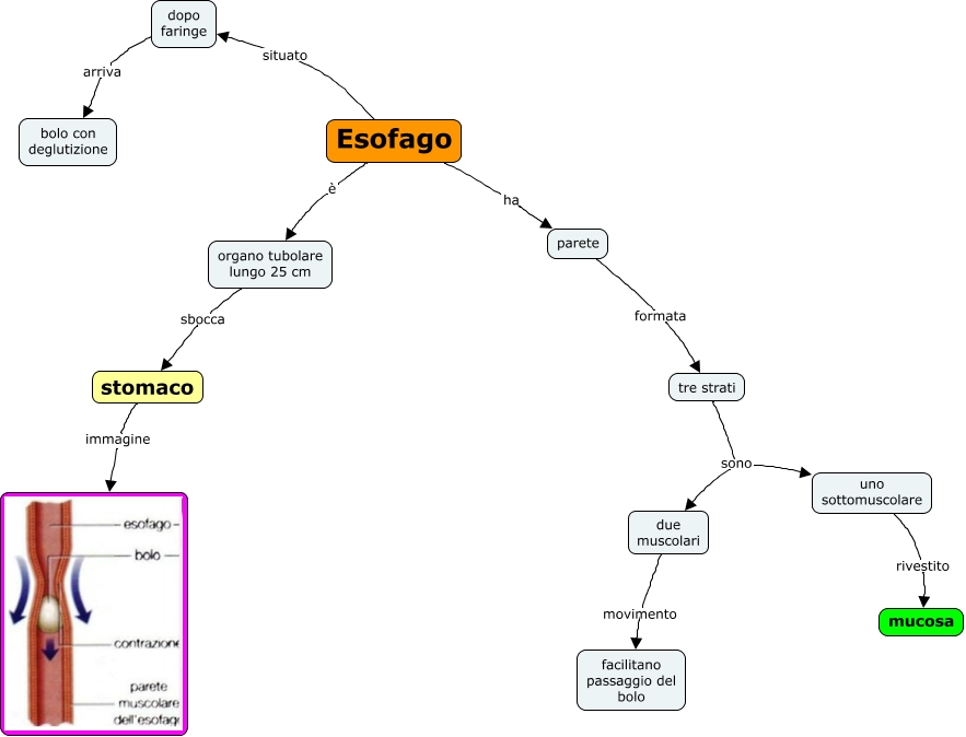 Questa Cmap, creata con IHMC CmapTools, contiene informazioni relative a: 15.05 esofago a, Esofago ha parete, dopo faringe arriva bolo con deglutizione, due muscolari movimento facilitano passaggio del bolo, parete formata tre strati, organo tubolare lungo 25 cm sbocca stomaco, Esofago situato dopo faringe, stomaco immagine, uno sottomuscolare rivestito mucosa, tre strati sono due muscolari, tre strati sono uno sottomuscolare, Esofago è organo tubolare lungo 25 cm