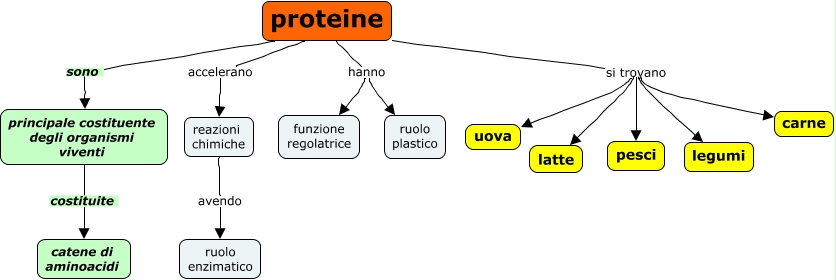 Questa Cmap, creata con IHMC CmapTools, contiene informazioni relative a: 14.07 proteine, proteine si trovano pesci, principale costituente degli organismi viventi costituite catene di aminoacidi, proteine si trovano uova, proteine hanno funzione regolatrice, proteine accelerano reazioni chimiche, proteine hanno ruolo plastico, proteine sono principale costituente degli organismi viventi, proteine si trovano legumi, proteine si trovano latte, proteine si trovano carne, reazioni chimiche avendo ruolo enzimatico