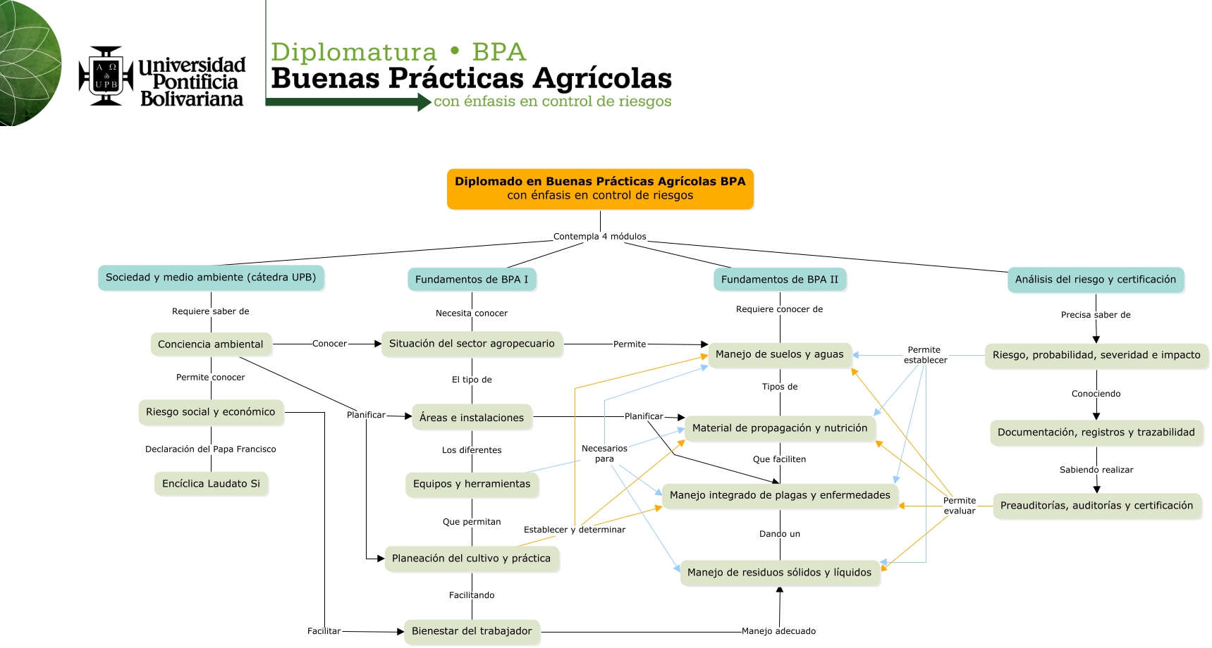 Este Cmap, tiene información relacionada con: VG_BPA (versión para editar), Fundamentos de BPA I Necesita conocer Situación del sector agropecuario, Manejo integrado de plagas y enfermedades Dando un Manejo de residuos sólidos y líquidos, Áreas e instalaciones Planificar Material de propagación y nutrición, Diplomado en Buenas Prácticas Agrícolas BPA con énfasis en control de riesgos Contempla 4 módulos Fundamentos de BPA II, Preauditorías, auditorías y certificación Permite evaluar Manejo de residuos sólidos y líquidos, Preauditorías, auditorías y certificación Permite evaluar Manejo integrado de plagas y enfermedades, Conciencia ambiental Conocer Situación del sector agropecuario, Conciencia ambiental Planificar Áreas e instalaciones, Riesgo, probabilidad, severidad e impacto Permite establecer Manejo de residuos sólidos y líquidos, Preauditorías, auditorías y certificación Permite evaluar Manejo de suelos y aguas, Documentación, registros y trazabilidad Sabiendo realizar Preauditorías, auditorías y certificación, Situación del sector agropecuario El tipo de Áreas e instalaciones, Preauditorías, auditorías y certificación Permite evaluar Material de propagación y nutrición, Áreas e instalaciones Planificar Manejo integrado de plagas y enfermedades, Riesgo social y económico Declaración del Papa Francisco Encíclica Laudato Si, Áreas e instalaciones Los diferentes Equipos y herramientas, Riesgo social y económico Facilitar Bienestar del trabajador, Manejo de suelos y aguas Tipos de Material de propagación y nutrición, Riesgo, probabilidad, severidad e impacto Permite establecer Manejo integrado de plagas y enfermedades, Riesgo, probabilidad, severidad e impacto Conociendo Documentación, registros y trazabilidad