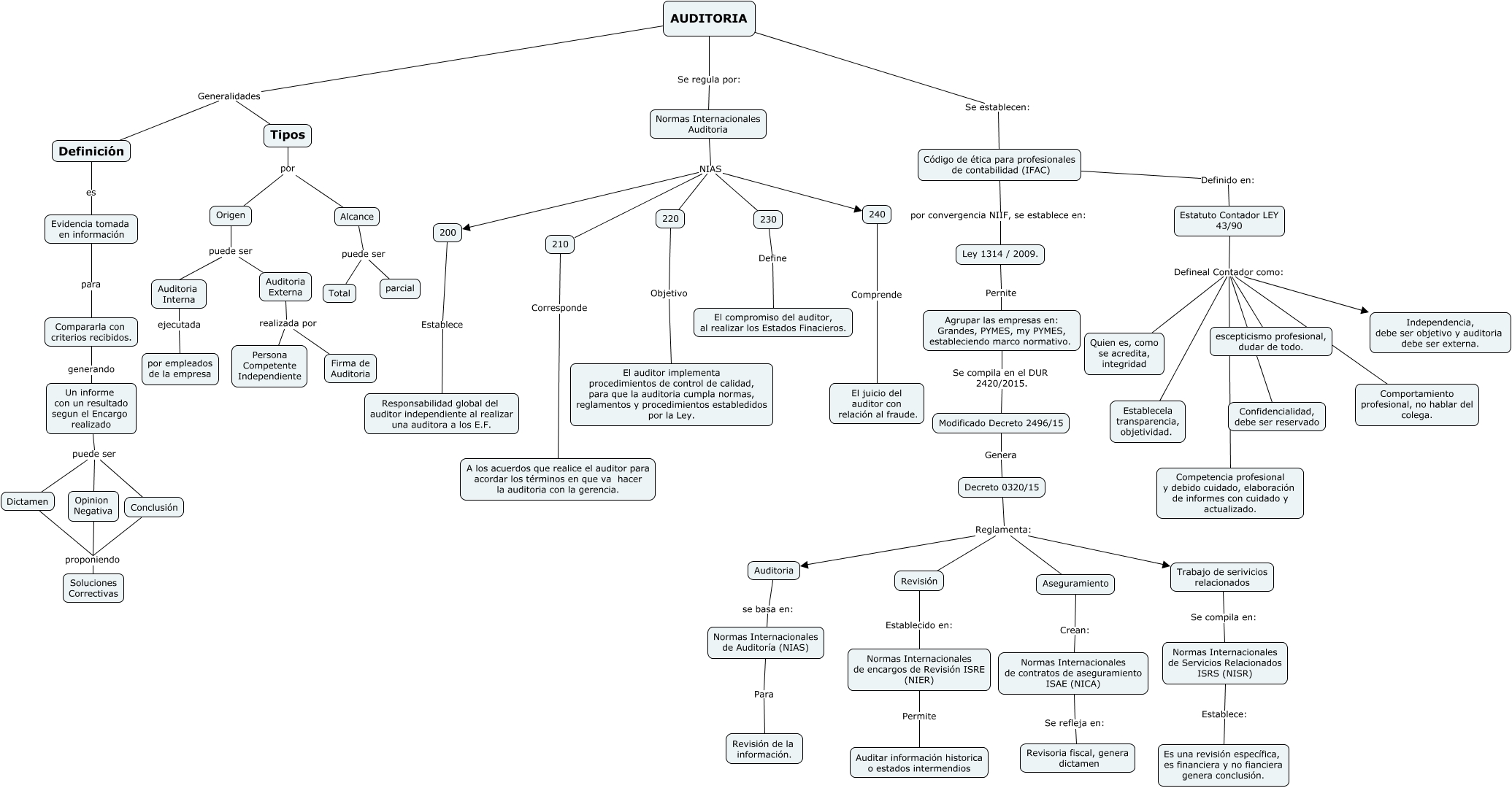 Este Cmap, tiene información relacionada con: Sin Título, Un informe con un resultado segun el Encargo realizado puede ser Opinion Negativa, Ley 1314 / 2009. Pernite Agrupar las empresas en: Grandes, PYMES, my PYMES, estableciendo marco normativo., 230 Define El compromiso del auditor, al realizar los Estados Finacieros., Estatuto Contador LEY 43/90 Defineal Contador como: Independencia, debe ser objetivo y auditoria debe ser externa., Origen puede ser Auditoria Externa, Auditoria Externa realizada por Firma de Auditoria, Normas Internacionales de contratos de aseguramiento ISAE (NICA) Se refleja en: Revisoria fiscal, genera dictamen, Modificado Decreto 2496/15 Genera Decreto 0320/15, 240 Comprende El juicio del auditor con relación al fraude., Estatuto Contador LEY 43/90 Defineal Contador como: Confidencialidad, debe ser reservado, Auditoria Interna ejecutada por empleados de la empresa, Un informe con un resultado segun el Encargo realizado puede ser Conclusión, Auditoria Externa realizada por Persona Competente Independiente, Estatuto Contador LEY 43/90 Defineal Contador como: escepticismo profesional, dudar de todo., Tipos por Alcance, Trabajo de serivicios relacionados Se compila en: Normas Internacionales de Servicios Relacionados ISRS (NISR), Normas Internacionales Auditoria NIAS 220, Alcance puede ser parcial, Auditoria se basa en: Normas Internacionales de Auditoría (NIAS), Origen puede ser Auditoria Interna