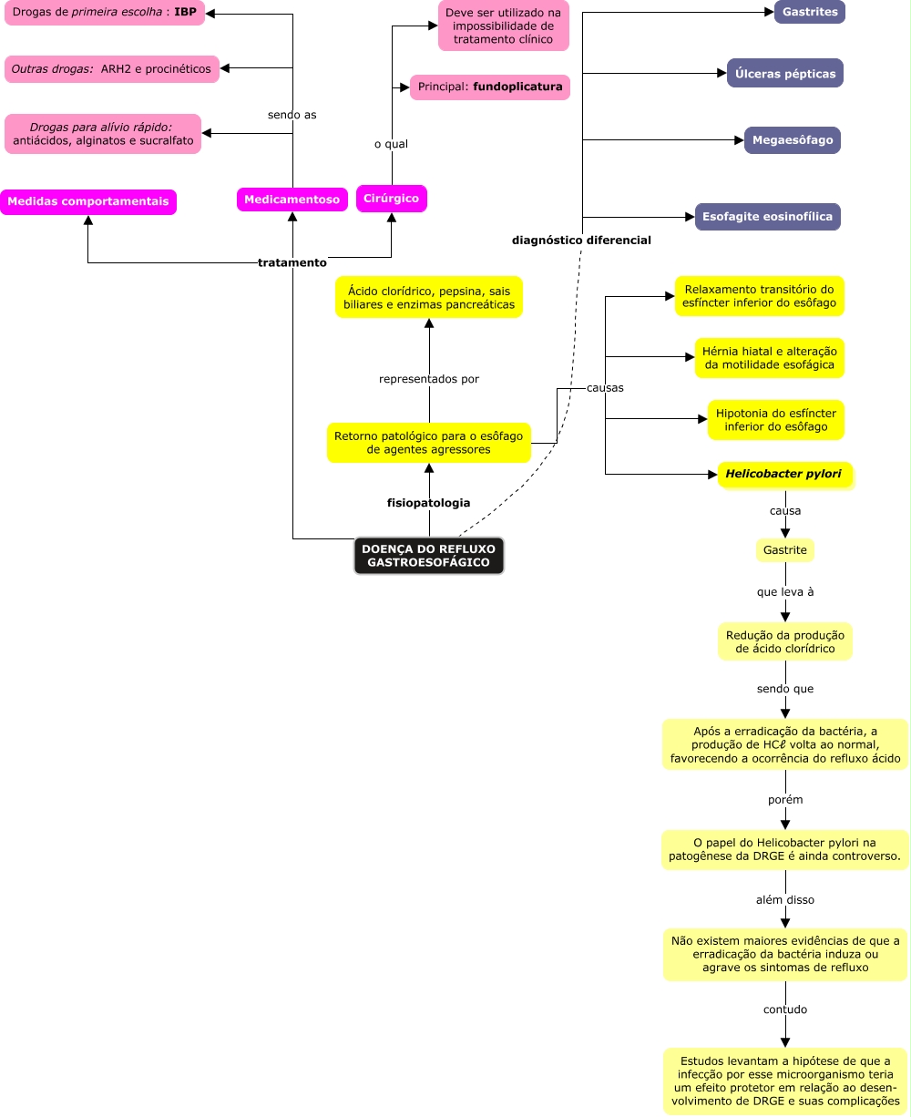 Esse mapa conceitual, produzido no IHMC CmapTools, tem a informação relacionada a: DRGE - 1º caso, Redução da produção de ácido clorídrico sendo que Após a erradicação da bactéria, a produção de HCℓ volta ao normal, favorecendo a ocorrência do refluxo ácido, Retorno patológico para o esôfago de agentes agressores causas Relaxamento transitório do esfíncter inferior do esôfago, DOENÇA DO REFLUXO GASTROESOFÁGICO diagnóstico diferencial Megaesôfago, O papel do Helicobacter pylori na patogênese da DRGE é ainda controverso. além disso Não existem maiores evidências de que a erradicação da bactéria induza ou agrave os sintomas de refluxo, DOENÇA DO REFLUXO GASTROESOFÁGICO fisiopatologia Retorno patológico para o esôfago de agentes agressores, Helicobacter pylori causa Gastrite, Retorno patológico para o esôfago de agentes agressores causas Hipotonia do esfíncter inferior do esôfago, Medicamentoso sendo as Drogas de primeira escolha: IBP, Medicamentoso sendo as Drogas para alívio rápido: antiácidos, alginatos e sucralfato, DOENÇA DO REFLUXO GASTROESOFÁGICO diagnóstico diferencial Úlceras pépticas, DOENÇA DO REFLUXO GASTROESOFÁGICO diagnóstico diferencial Esofagite eosinofílica, Gastrite que leva à Redução da produção de ácido clorídrico, Não existem maiores evidências de que a erradicação da bactéria induza ou agrave os sintomas de refluxo contudo Estudos levantam a hipótese de que a infecção por esse microorganismo teria um efeito protetor em relação ao desen- volvimento de DRGE e suas complicações, DOENÇA DO REFLUXO GASTROESOFÁGICO diagnóstico diferencial Gastrites, Retorno patológico para o esôfago de agentes agressores causas Helicobacter pylori, Cirúrgico o qual Deve ser utilizado na impossibilidade de tratamento clínico, Retorno patológico para o esôfago de agentes agressores representados por Ácido clorídrico, pepsina, sais biliares e enzimas pancreáticas, DOENÇA DO REFLUXO GASTROESOFÁGICO tratamento Medicamentoso, DOENÇA DO REFLUXO GASTROESOFÁGICO tratamento Medidas comportamentais, Medicamentoso sendo as Outras drogas: ARH2 e procinéticos