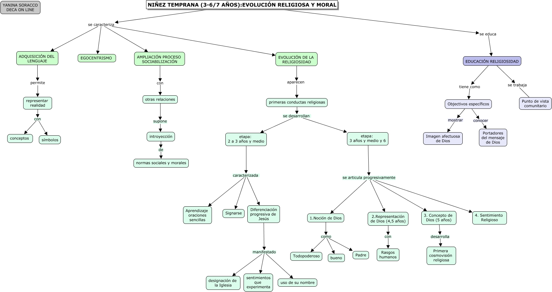 Este Cmap, tiene información relacionada con: Evolución religiosa y moral_ Niñez temprana, primeras conductas religiosas se desarrollan etapa: 2 a 3 años y medio, 3. Concepto de Dios (5 años) desarrolla Primera cosmovisión religiosa, 1.Noción de Dios como Todopoderoso, representar realidad con conceptos, ADQUISICIÓN DEL LENGUAJE permite representar realidad, etapa: 3 años y medio y 6 se articula progresivamente 3. Concepto de Dios (5 años), EDUCACIÓN RELIGIOSIDAD se trabaja Punto de vista comunitario, etapa: 3 años y medio y 6 se articula progresivamente 4. Sentimiento Religioso, Objectivos específicos mostrar Imagen afectuosa de Dios, NIÑEZ TEMPRANA (3-6/7 AÑOS):EVOLUCIÓN RELIGIOSA Y MORAL se caracteriza EGOCENTRISMO, otras relaciones supone introyección, representar realidad con símbolos, primeras conductas religiosas se desarrollan etapa: 3 años y medio y 6, etapa: 3 años y medio y 6 se articula progresivamente 1.Noción de Dios, etapa: 2 a 3 años y medio caracterizada Signarse, NIÑEZ TEMPRANA (3-6/7 AÑOS):EVOLUCIÓN RELIGIOSA Y MORAL se caracteriza EVOLUCIÓN DE LA RELIGIOSIDAD, AMPLIACIÓN PROCESO SOCIABILIZACIÓN con otras relaciones, Diferenciación progresiva de Jesús manifestado designación de la Iglesia, etapa: 3 años y medio y 6 se articula progresivamente 2.Representación de Dios (4,5 años), NIÑEZ TEMPRANA (3-6/7 AÑOS):EVOLUCIÓN RELIGIOSA Y MORAL se caracteriza ADQUISICIÓN DEL LENGUAJE