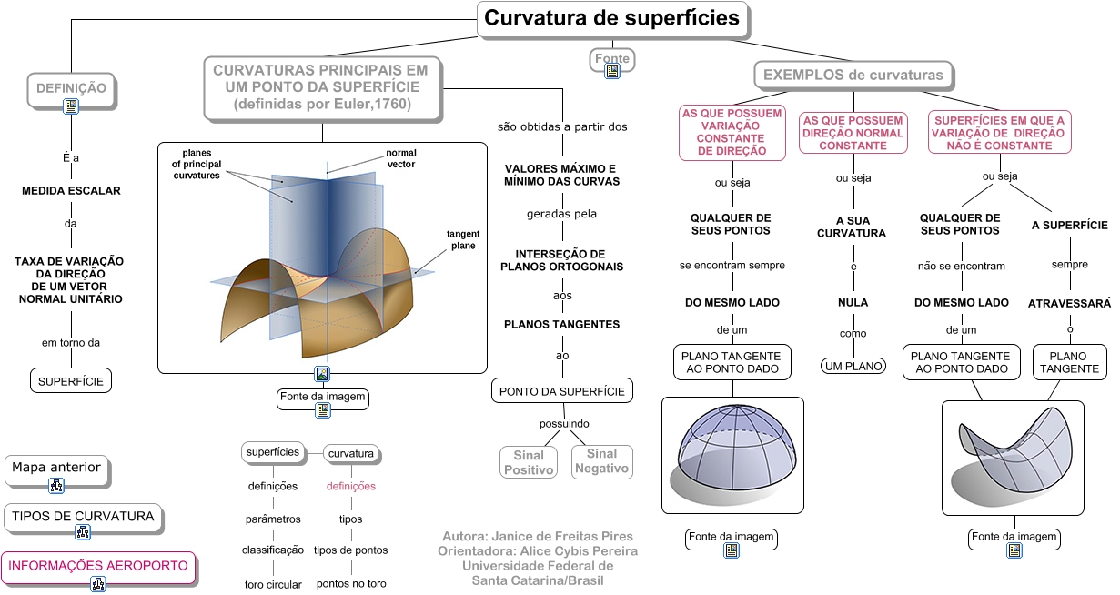 Esse mapa conceitual, produzido no IHMC CmapTools, tem a informação relacionada a: curvatura_fundamentos, tipos de pontos pontos no toro, Curvatura de superfícies Fonte, definições parâmetros, EXEMPLOS de curvaturas AS QUE POSSUEM VARIAÇÃO CONSTANTE DE DIREÇÃO, A SUPERFÍCIE sempre ATRAVESSARÁ, QUALQUER DE SEUS PONTOS se encontram sempre DO MESMO LADO, MEDIDA ESCALAR da TAXA DE VARIAÇÃO DA DIREÇÃO DE UM VETOR NORMAL UNITÁRIO, superfícies definições, DO MESMO LADO de um PLANO TANGENTE AO PONTO DADO, TAXA DE VARIAÇÃO DA DIREÇÃO DE UM VETOR NORMAL UNITÁRIO em torno da SUPERFÍCIE, PLANOS TANGENTES ao PONTO DA SUPERFÍCIE, AS QUE POSSUEM DIREÇÃO NORMAL CONSTANTE ou seja A SUA CURVATURA, CURVATURAS PRINCIPAIS EM UM PONTO DA SUPERFÍCIE (definidas por Euler,1760) são obtidas a partir dos VALORES MÁXIMO E MÍNIMO DAS CURVAS, A SUA CURVATURA é NULA, Fonte da imagem, NULA como UM PLANO, PLANO TANGENTE, curvatura definições, PLANO TANGENTE AO PONTO DADO, tipos tipos de pontos