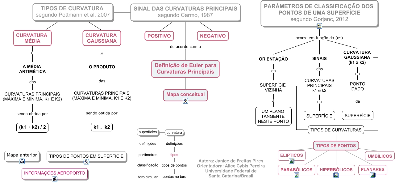Esse mapa conceitual, produzido no IHMC CmapTools, tem a informação relacionada a: tipos_curvatura, curvatura definições, PARÂMETROS DE CLASSIFICAÇÃO DOS PONTOS DE UMA SUPERFÍCIE segundo Gorjanc, 2012 ocorre em função da (os) CURVATURA GAUSSIANA (k1 x k2), SINAIS das CURVATURAS PRINCIPAIS k1 e k2, CURVATURA GAUSSIANA é O PRODUTO, superfícies curvatura, classificação toro circular, CURVATURA GAUSSIANA (k1 x k2) no PONTO DADO, CURVATURA GAUSSIANA (k1 x k2) TIPOS DE CURVATURAS, SUPERFÍCIE VIZINHA a UM PLANO TANGENTE NESTE PONTO, SINAL DAS CURVATURAS PRINCIPAIS segundo Carmo, 1987 de acordo com a Definição de Euler para Curvaturas Principais, O PRODUTO das CURVATURAS PRINCIPAIS (MÁXIMA E MÍNIMA, K1 E K2), TIPOS DE PONTOS PLANARES, parâmetros classificação, CURVATURAS PRINCIPAIS k1 e k2 TIPOS DE CURVATURAS, CURVATURA MÉDIA é A MÉDIA ARTIMÉTICA, PONTO DADO da SUPERFÍCIE, TIPOS DE CURVATURA segundo Pottmann et al, 2007 SINAL DAS CURVATURAS PRINCIPAIS segundo Carmo, 1987, TIPOS DE PONTOS ELÍPTICOS, A MÉDIA ARTIMÉTICA das CURVATURAS PRINCIPAIS (MÁXIMA E MÍNIMA, K1 E K2), tipos tipos de pontos
