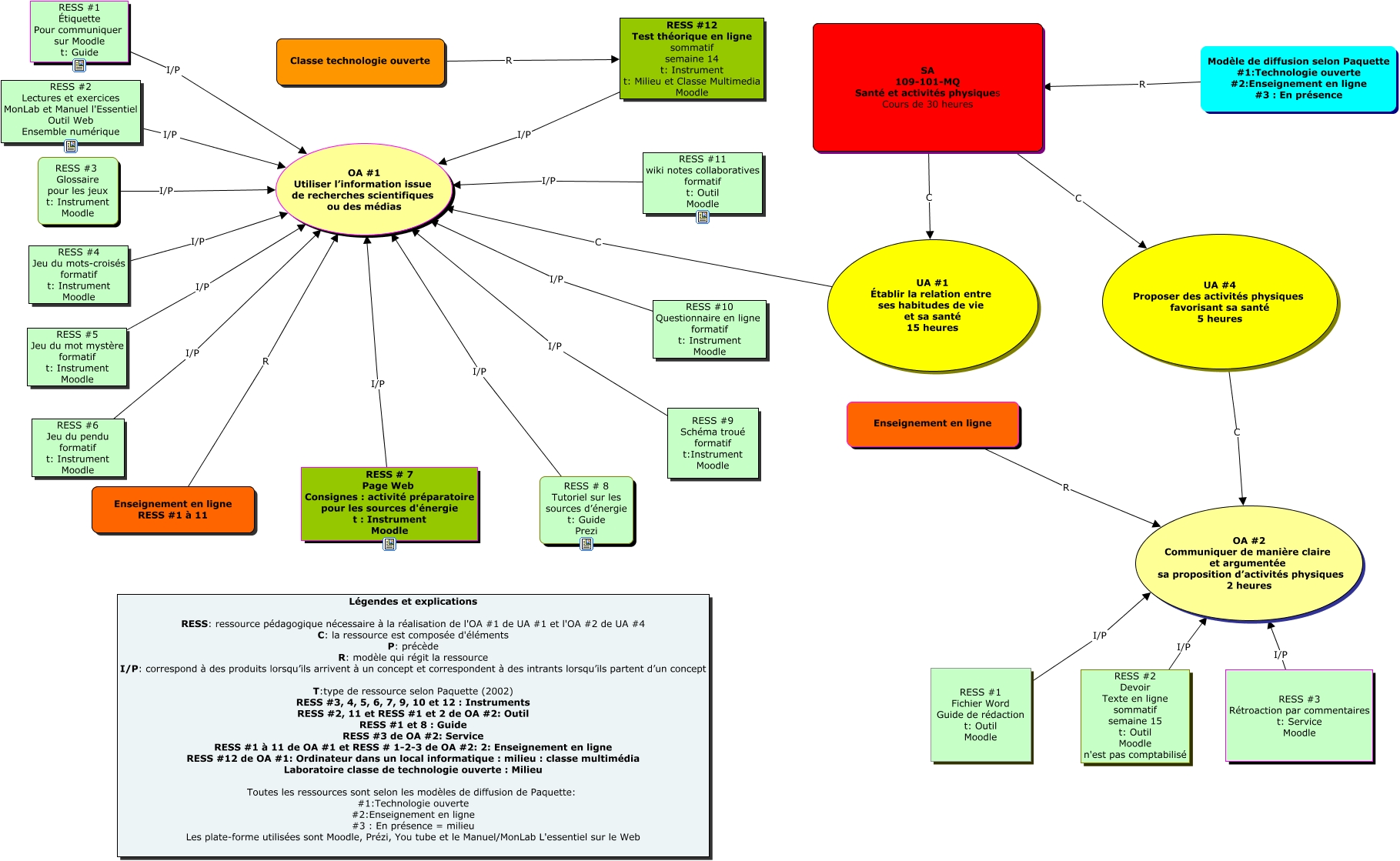 Cette carte de concepts créée avec IHMC CmapTools traite de: Deroulement de la formation en ligne pas a pas, UA #4 Proposer des activités physiques favorisant sa santé 5 heures C OA #2 Communiquer de manière claire et argumentée sa proposition d’activités physiques 2 heures, RESS #5 Jeu du mot mystère formatif t: Instrument Moodle I/P OA #1 Utiliser l’information issue de recherches scientifiques ou des médias, Enseignement en ligne R OA #2 Communiquer de manière claire et argumentée sa proposition d’activités physiques 2 heures, RESS #11 wiki notes collaboratives formatif t: Outil Moodle I/P OA #1 Utiliser l’information issue de recherches scientifiques ou des médias, RESS #10 Questionnaire en ligne formatif t: Instrument Moodle I/P OA #1 Utiliser l’information issue de recherches scientifiques ou des médias, RESS # 7 Page Web Consignes : activité préparatoire pour les sources d'énergie t : Instrument Moodle I/P OA #1 Utiliser l’information issue de recherches scientifiques ou des médias, RESS # 8 Tutoriel sur les sources d’énergie t: Guide Prezi I/P OA #1 Utiliser l’information issue de recherches scientifiques ou des médias, RESS #9 Schéma troué formatif t:Instrument Moodle I/P OA #1 Utiliser l’information issue de recherches scientifiques ou des médias, RESS #6 Jeu du pendu formatif t: Instrument Moodle I/P OA #1 Utiliser l’information issue de recherches scientifiques ou des médias, Enseignement en ligne RESS #1 à 11 R OA #1 Utiliser l’information issue de recherches scientifiques ou des médias, RESS #1 Fichier Word Guide de rédaction t: Outil Moodle I/P OA #2 Communiquer de manière claire et argumentée sa proposition d’activités physiques 2 heures, UA #1 Établir la relation entre ses habitudes de vie et sa santé 15 heures C OA #1 Utiliser l’information issue de recherches scientifiques ou des médias, Classe technologie ouverte R RESS #12 Test théorique en ligne sommatif semaine 14 t: Instrument t: Milieu et Classe Multimedia Moodle, RESS #2 Devoir Texte en ligne sommatif semaine 15 t: Outil Moodle n'est pas comptabilisé I/P OA #2 Communiquer de manière claire et argumentée sa proposition d’activités physiques 2 heures, SA 109-101-MQ Santé et activités physiques Cours de 30 heures C UA #1 Établir la relation entre ses habitudes de vie et sa santé 15 heures, RESS #12 Test théorique en ligne sommatif semaine 14 t: Instrument t: Milieu et Classe Multimedia Moodle I/P OA #1 Utiliser l’information issue de recherches scientifiques ou des médias, RESS #4 Jeu du mots-croisés formatif t: Instrument Moodle I/P OA #1 Utiliser l’information issue de recherches scientifiques ou des médias, RESS #3 Rétroaction par commentaires t: Service Moodle I/P OA #2 Communiquer de manière claire et argumentée sa proposition d’activités physiques 2 heures, SA 109-101-MQ Santé et activités physiques Cours de 30 heures C UA #4 Proposer des activités physiques favorisant sa santé 5 heures, RESS #2 Lectures et exercices MonLab et Manuel l'Essentiel Outil Web Ensemble numérique I/P OA #1 Utiliser l’information issue de recherches scientifiques ou des médias
