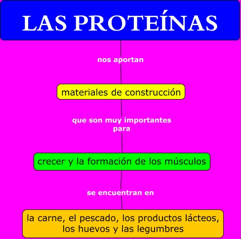 Este Cmap, tiene información relacionada con: Las proteínas, crecer y la formación de los músculos se encuentran en la carne, el pescado, los productos lácteos, los huevos y las legumbres, materiales de construcción que son muy importantes para crecer y la formación de los músculos, LAS PROTEÍNAS nos aportan materiales de construcción