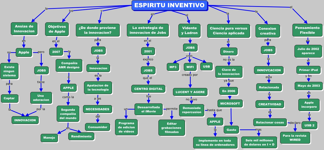 Este Cmap, tiene información relacionada con: Espiritu Inventivo, Apple incorporo la USB 2, Dessarrollada el iMovie un Programa de edicion de videos, ESPIRITU INVENTIVO en La estretegia de innovacion de Jobs, ESPIRITU INVENTIVO la Ansias de Innovacion, Objetivos de Apple en el 2007, JOBS la INNOVCACION, Existe ningun sistema para Captar, ESPIRITU INVENTIVO el Pensamiento Flexible, CREATIVIDAD es Relacionar cosas, WIFI creado por LUCENT Y AGERE, JOBS creo USB, Primer iPod y en Mayo de 2003, Ansias de Innovacion en Apple, NECESIDADES del Consumidor, Segunda compañia del mundo en Manejo, Una adoracion por la INNOVACION, 2007 la Compañia AMR designo, ESPIRITU INVENTIVO y ¿De donde proviene la innovacion?, Compañia AMR designo a APPLE, Julio de 2002 aparece el Primer iPod