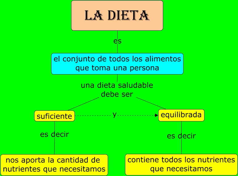 Este Cmap, tiene información relacionada con: La dieta, suficiente y equilibrada, el conjunto de todos los alimentos que toma una persona una dieta saludable debe ser equilibrada, el conjunto de todos los alimentos que toma una persona una dieta saludable debe ser suficiente, suficiente es decir nos aporta la cantidad de nutrientes que necesitamos, LA DIETA es el conjunto de todos los alimentos que toma una persona, equilibrada es decir contiene todos los nutrientes que necesitamos