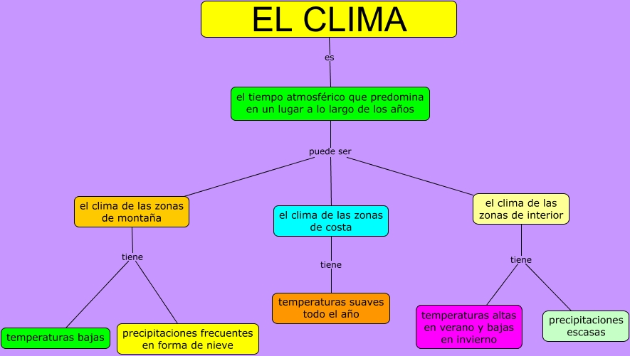 Este Cmap, tiene información relacionada con: El clima, el clima de las zonas de interior tiene temperaturas altas en verano y bajas en invierno, EL CLIMA es el tiempo atmosférico que predomina en un lugar a lo largo de los años, el tiempo atmosférico que predomina en un lugar a lo largo de los años puede ser el clima de las zonas de costa, el clima de las zonas de interior tiene precipitaciones escasas, el tiempo atmosférico que predomina en un lugar a lo largo de los años puede ser el clima de las zonas de montaña, el tiempo atmosférico que predomina en un lugar a lo largo de los años puede ser el clima de las zonas de interior, el clima de las zonas de montaña tiene temperaturas bajas, el clima de las zonas de montaña tiene precipitaciones frecuentes en forma de nieve, el clima de las zonas de costa tiene temperaturas suaves todo el año