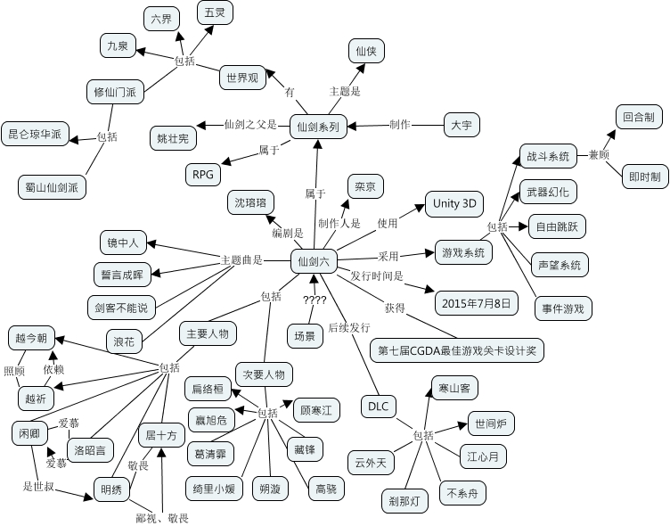 此概念图以 IHMC CmapTools 创建, 内含信息有关于: 仙剑(潘), 次要人物 包括 藏锋, 仙剑六 主题曲是 剑客不能说, DLC 包括 刹那灯, 仙剑六 采用 游戏系统, 主要人物 包括 洛昭言, DLC 包括 云外天, 次要人物 包括 朔漩, 仙剑系列 主题是 仙侠, 次要人物 包括 顾寒江, 游戏系统 包括 武器幻化, 主要人物 包括 越祈, 大宇 制作 仙剑系列, 主要人物 包括 越今朝, 越祈 依赖 越今朝, 闲卿 爱慕 洛昭言, 主要人物 包括 居十方, 战斗系统 兼顾 回合制, 战斗系统 兼顾 即时制, 场景 ???? 仙剑六, 仙剑六 发行时间是 2015年7月8日
