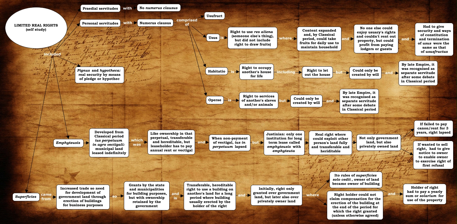 This Concept Map, created with IHMC CmapTools, has information related to: 12 3 Servitudes self study, Right to services of another's slaves and/or animals but Could only be created by will, Superficies came from Increased trade so need for development of government land through erection of buildings for business purposes, When non-payment of vectigal, ius in perpetuum lapsed but Justinian: only one institution for long term lease called emphyteusis with emphyteuta, Right holder could not claim compensation for the erection of the building at the end of the period for which the right granted (unless otherwise agreed) and Holder of right had to pay a yearly sum or solarium for use of the property, LIMITED REAL RIGHTS (self study) included Praedial servitudes, No one else could enjoy usuary's rights and couldn't rent out property, but could profit from paying lodgers or guests and Had to give security and ways of constitution and termination of usus were the same as that of ususfructus, LIMITED REAL RIGHTS (self study) included Emphyteusis, Personal servitudes with Numerus clausus, Developed from Classical period ius perpetuum in agro vectigali: municipal land leased indefinitely which was Like ownership in that perpetual, transferable and hereditable, but leaseholder has to pay annual rent or vectigal, Justinian: only one institution for long term lease called emphyteusis with emphyteuta ???? Real right where could exploit other person's land fully and transferable and heriditable, Real right where could exploit other person's land fully and transferable and heriditable ???? Not only government land, but also privately owned land, Could only be created by will and By late Empire, it was recognised as separate servitude after some debate in Classical period, Content expanded and, by Classical period, could take fruits for daily use to maintain household and No one else could enjoy usuary's rights and couldn't rent out property, but could profit from paying lodgers or guests, Numerus clausus comprised of Operae, Could only be created by will and By late Empire, it was recognised as separate servitude after some debate in Classical period, Praedial servitudes with No numerus clausus, Operae is Right to services of another's slaves and/or animals, Initially, right only granted over government land, but later also over privately owner land where Right holder could not claim compensation for the erection of the building at the end of the period for which the right granted (unless otherwise agreed), Numerus clausus comprised of Usus, LIMITED REAL RIGHTS (self study) included Pignus and hypotheca: real security by means of pledge or hypothec