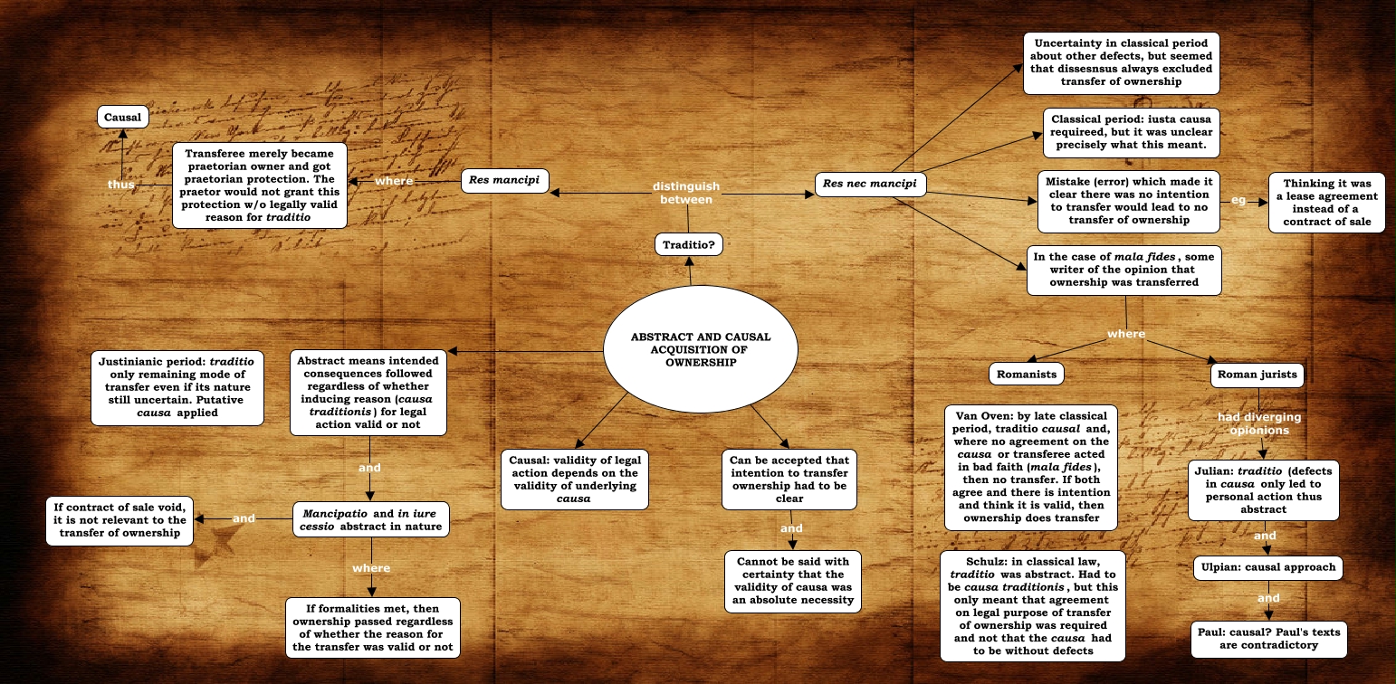 This Concept Map, created with IHMC CmapTools, has information related to: 05 Abstract and causal methods of acquisition, Ulpian: causal approach and Paul: causal? Paul's texts are contradictory, Transferee merely became praetorian owner and got praetorian protection. The praetor would not grant this protection w/o legally valid reason for traditio thus Causal, Res mancipi where Transferee merely became praetorian owner and got praetorian protection. The praetor would not grant this protection w/o legally valid reason for traditio, Roman jurists had diverging opionions Julian: traditio (defects in causa only led to personal action thus abstract, ABSTRACT AND CAUSAL ACQUISITION OF OWNERSHIP ???? Causal: validity of legal action depends on the validity of underlying causa, In the case of mala fides, some writer of the opinion that ownership was transferred where Roman jurists, Traditio? distinguish between Res nec mancipi, ABSTRACT AND CAUSAL ACQUISITION OF OWNERSHIP ???? Traditio?, Mistake (error) which made it clear there was no intention to transfer would lead to no transfer of ownership eg Thinking it was a lease agreement instead of a contract of sale, Can be accepted that intention to transfer ownership had to be clear and Cannot be said with certainty that the validity of causa was an absolute necessity, Traditio? distinguish between Res mancipi, Res nec mancipi ???? Mistake (error) which made it clear there was no intention to transfer would lead to no transfer of ownership, Mancipatio and in iure cessio abstract in nature where If formalities met, then ownership passed regardless of whether the reason for the transfer was valid or not, Res nec mancipi ???? In the case of mala fides, some writer of the opinion that ownership was transferred, Res nec mancipi ???? Classical period: iusta causa requireed, but it was unclear precisely what this meant., Res nec mancipi ???? Uncertainty in classical period about other defects, but seemed that dissesnsus always excluded transfer of ownership, ABSTRACT AND CAUSAL ACQUISITION OF OWNERSHIP ???? Can be accepted that intention to transfer ownership had to be clear, Mancipatio and in iure cessio abstract in nature and If contract of sale void, it is not relevant to the transfer of ownership, In the case of mala fides, some writer of the opinion that ownership was transferred where Romanists, ABSTRACT AND CAUSAL ACQUISITION OF OWNERSHIP ???? Abstract means intended consequences followed regardless of whether inducing reason (causa traditionis) for legal action valid or not