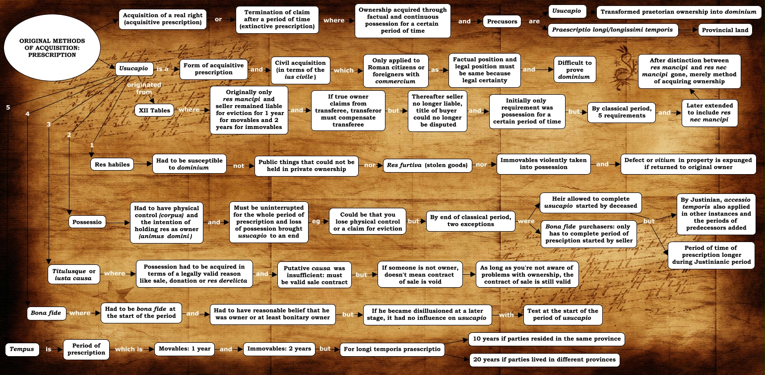 This Concept Map, created with IHMC CmapTools, has information related to: 06 Original methods of acquisition usucapio, Immovables: 2 years but For longi temporis praescriptio, Usucapio is a Form of acquisitive prescription, Had to have reasonable belief that he was owner or at least bonitary owner but If he became disillusioned at a later stage, it had no influence on usucapio, If someone is not owner, doesn't mean contract of sale is void ???? As long as you're not aware of problems with ownership, the contract of sale is still valid, Had to be susceptible to dominium not Public things that could not be held in private ownership, If true owner claims from transferee, transferor must compensate transferee but Thereafter seller no longer liable, title of buyer could no longer be disputed, ORIGINAL METHODS OF ACQUISITION: PRESCRIPTION ???? Usucapio, If he became disillusioned at a later stage, it had no influence on usucapio with Test at the start of the period of usucapio, Civil acquisition (in terms of the ius civile) which Only applied to Roman citizens or foreigners with commercium, Termination of claim after a period of time (extinctive prescription) where Ownership acquired through factual and continuous possession for a certain period of time, Titulusque or iusta causa where Possession had to be acquired in terms of a legally valid reason like sale, donation or res derelicta, Initially only requirement was possession for a certain period of time but By classical period, 5 requirements, By end of classical period, two exceptions were Heir allowed to complete usucapio started by deceased, Precusors are Praescriptio longi/longissimi temporis, Thereafter seller no longer liable, title of buyer could no longer be disputed and Initially only requirement was possession for a certain period of time, Bona fide purchasers: only has to complete period of presciption started by seller but Period of time of prescription longer during Justinianic period, Usucapio 2 Possessio, Usucapio 3 Titulusque or iusta causa, Res habiles ???? Had to be susceptible to dominium, Usucapio 4 Bona fide