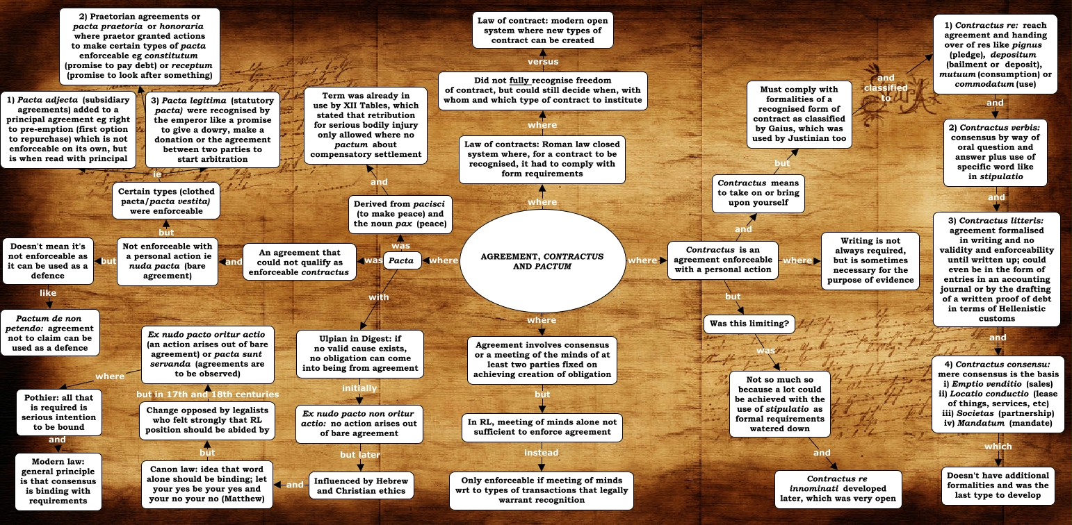 This Concept Map, created with IHMC CmapTools, has information related to: 01 3 Agreements, contractus and pactum, Doesn't mean it's not enforceable as it can be used as a defence like Pactum de non petendo: agreement not to claim can be used as a defence, Law of contracts: Roman law closed system where, for a contract to be recognised, it had to comply with form requirements where Did not fully recognise freedom of contract, but could still decide when, with whom and which type of contract to institute, AGREEMENT, CONTRACTUS AND PACTUM where Contractus is an agreement enforceable with a personal action, Contractus is an agreement enforceable with a personal action where Writing is not always required, but is sometimes necessary for the purpose of evidence, Pacta was Derived from pacisci (to make peace) and the noun pax (peace), Certain types (clothed pacta/pacta vestita) were enforceable ie 3) Pacta legitima (statutory pacta) were recognised by the emperor like a promise to give a dowry, make a donation or the agreement between two parties to start arbitration, Agreement involves consensus or a meeting of the minds of at least two parties fixed on achieving creation of obligation but In RL, meeting of minds alone not sufficient to enforce agreement, AGREEMENT, CONTRACTUS AND PACTUM where Agreement involves consensus or a meeting of the minds of at least two parties fixed on achieving creation of obligation, Ulpian in Digest: if no valid cause exists, no obligation can come into being from agreement initially Ex nudo pacto non oritur actio: no action arises out of bare agreement, Change opposed by legalists who felt strongly that RL position should be abided by but in 17th and 18th centuries Ex nudo pacto oritur actio (an action arises out of bare agreement) or pacta sunt servanda (agreements are to be observed), 3) Contractus litteris: agreement formalised in writing and no validity and enforceability until written up; could even be in the form of entries in an accounting journal or by the drafting of a written proof of debt in terms of Hellenistic customs and 4) Contractus consensu: mere consensus is the basis i) Emptio venditio (sales) ii) Locatio conductio (lease of things, services, etc) iii) Societas (partnership) iv) Mandatum (mandate), AGREEMENT, CONTRACTUS AND PACTUM where Pacta, Pacta was An agreement that could not qualify as enforceable contractus, Not enforceable with a personal action ie nuda pacta (bare agreement) but Certain types (clothed pacta/pacta vestita) were enforceable, Derived from pacisci (to make peace) and the noun pax (peace) and Term was already in use by XII Tables, which stated that retribution for serious bodily injury only allowed where no pactum about compensatory settlement, Canon law: idea that word alone should be binding; let your yes be your yes and your no your no (Matthew) but Change opposed by legalists who felt strongly that RL position should be abided by, Certain types (clothed pacta/pacta vestita) were enforceable ie 2) Praetorian agreements or pacta praetoria or honoraria where praetor granted actions to make certain types of pacta enforceable eg constitutum (promise to pay debt) or receptum (promise to look after something), Contractus is an agreement enforceable with a personal action but Was this limiting?, Pothier: all that is required is serious intention to be bound and Modern law: general principle is that consensus is binding with requirements, In RL, meeting of minds alone not sufficient to enforce agreement instead Only enforceable if meeting of minds wrt to types of transactions that legally warrant recognition