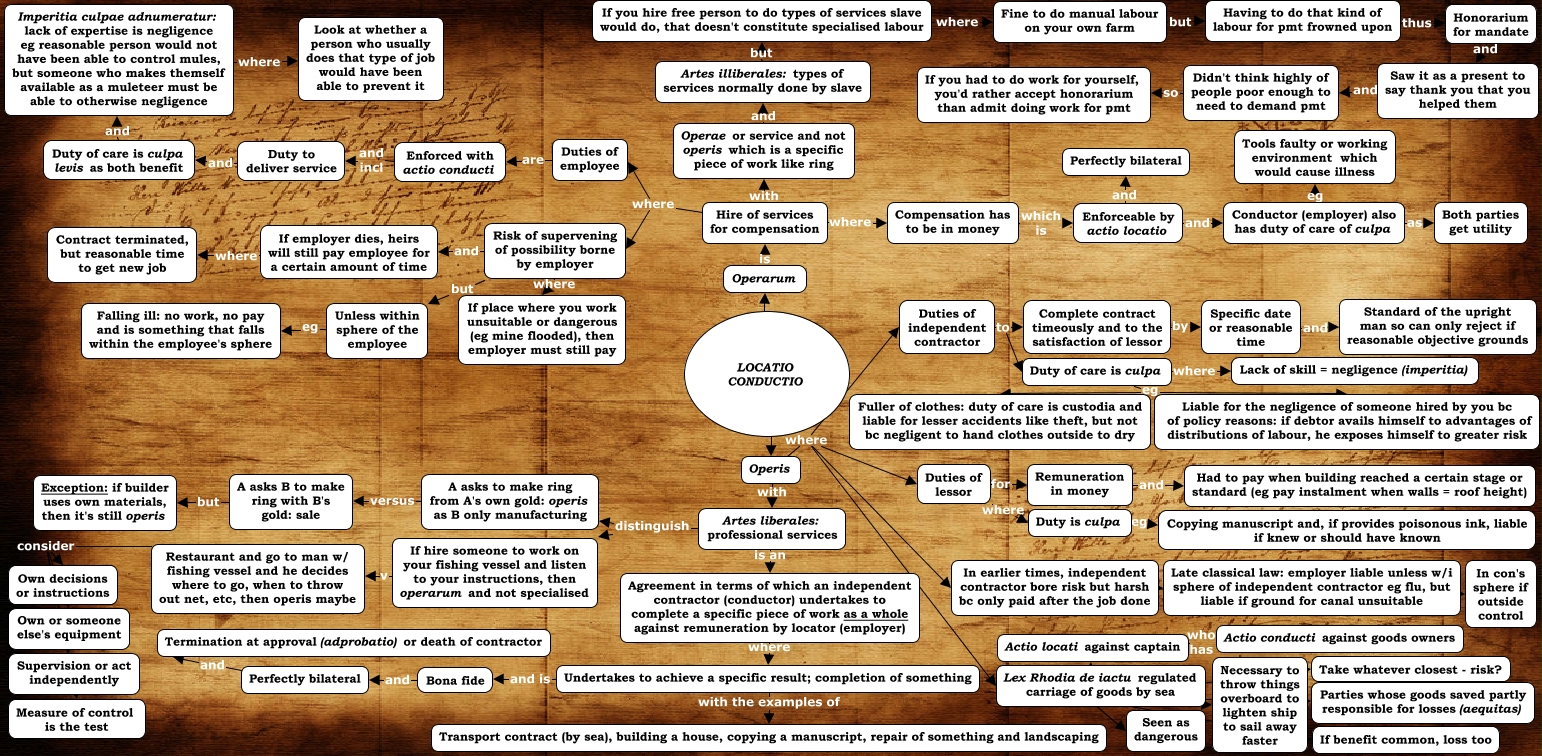 This Concept Map, created with IHMC CmapTools, has information related to: 04 2 Locatio conductio operis and operarum, Agreement in terms of which an independent contractor (conductor) undertakes to complete a specific piece of work as a whole against remuneration by locator (employer) where Undertakes to achieve a specific result; completion of something, A asks to make ring from A's own gold: operis as B only manufacturing versus A asks B to make ring with B's gold: sale, Restaurant and go to man w/ fishing vessel and he decides where to go, when to throw out net, etc, then operis maybe consider Own or someone else's equipment, In earlier times, independent contractor bore risk but harsh bc only paid after the job done ???? Late classical law: employer liable unless w/i sphere of independent contractor eg flu, but liable if ground for canal unsuitable, Duty of care is culpa eg Liable for the negligence of someone hired by you bc of policy reasons: if debtor avails himself to advantages of distributions of labour, he exposes himself to greater risk, Hire of services for compensation with Operae or service and not operis which is a specific piece of work like ring, Artes liberales: professional services is an Agreement in terms of which an independent contractor (conductor) undertakes to complete a specific piece of work as a whole against remuneration by locator (employer), Undertakes to achieve a specific result; completion of something and is Bona fide, Undertakes to achieve a specific result; completion of something with the examples of Transport contract (by sea), building a house, copying a manuscript, repair of something and landscaping, Enforceable by actio locatio and Conductor (employer) also has duty of care of culpa, Complete contract timeously and to the satisfaction of lessor by Specific date or reasonable time, Artes liberales: professional services distinguish A asks to make ring from A's own gold: operis as B only manufacturing, If employer dies, heirs will still pay employee for a certain amount of time where Contract terminated, but reasonable time to get new job, Operarum is Hire of services for compensation, Actio locati against captain who has Actio conducti against goods owners, Fine to do manual labour on your own farm but Having to do that kind of labour for pmt frowned upon, Operae or service and not operis which is a specific piece of work like ring and Artes illiberales: types of services normally done by slave, LOCATIO CONDUCTIO ???? Operis, Enforced with actio conducti and incl Duty to deliver service, Duties of independent contractor to Complete contract timeously and to the satisfaction of lessor