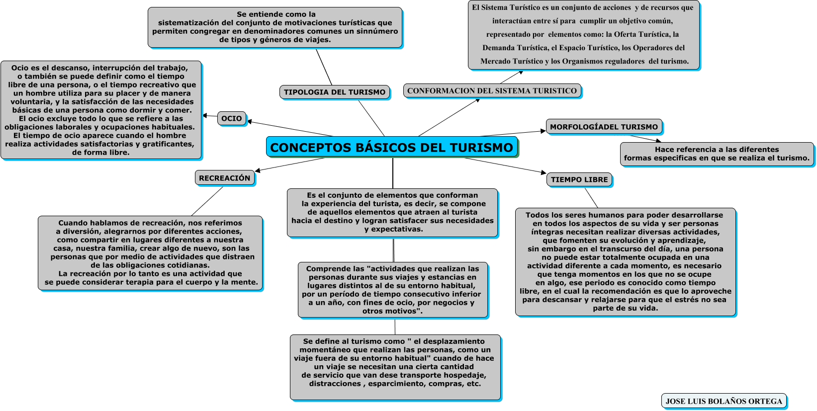 Este Cmap, tiene información relacionada con: Jose Luis Bolaños, CONCEPTOS BÁSICOS DEL TURISMO ???? Es el conjunto de elementos que conforman la experiencia del turista, es decir, se compone de aquellos elementos que atraen al turista hacia el destino y logran satisfacer sus necesidades y expectativas., CONFORMACION DEL SISTEMA TURISTICO ???? El Sistema Turístico es un conjunto de acciones y de recursos que interactúan entre sí para cumplir un objetivo común, representado por elementos como: la Oferta Turística, la Demanda Turística, el Espacio Turístico, los Operadores del Mercado Turístico y los Organismos reguladores del turismo., TIPOLOGIA DEL TURISMO ???? Se entiende como la sistematización del conjunto de motivaciones turísticas que permiten congregar en denominadores comunes un sinnúmero de tipos y géneros de viajes., MORFOLOGÍADEL TURISMO ???? Hace referencia a las diferentes formas especificas en que se realiza el turismo., CONCEPTOS BÁSICOS DEL TURISMO ???? Se define al turismo como " el desplazamiento momentáneo que realizan las personas, como un viaje fuera de su entorno habitual" cuando de hace un viaje se necesitan una cierta cantidad de servicio que van dese transporte hospedaje, distracciones , esparcimiento, compras, etc., RECREACIÓN ???? Cuando hablamos de recreación, nos referimos a diversión, alegrarnos por diferentes acciones, como compartir en lugares diferentes a nuestra casa, nuestra familia, crear algo de nuevo, son las personas que por medio de actividades que distraen de las obligaciones cotidianas. La recreación por lo tanto es una actividad que se puede considerar terapia para el cuerpo y la mente., CONCEPTOS BÁSICOS DEL TURISMO ???? OCIO, CONCEPTOS BÁSICOS DEL TURISMO ???? TIEMPO LIBRE, CONCEPTOS BÁSICOS DEL TURISMO ???? MORFOLOGÍADEL TURISMO, OCIO ???? Ocio es el descanso, interrupción del trabajo, o también se puede definir como el tiempo libre de una persona, o el tiempo recreativo que un hombre utiliza para su placer y de manera voluntaria, y la satisfacción de las necesidades básicas de una persona como dormir y comer. El ocio excluye todo lo que se refiere a las obligaciones laborales y ocupaciones habituales. El tiempo de ocio aparece cuando el hombre realiza actividades satisfactorias y gratificantes, de forma libre., TIEMPO LIBRE ???? Todos los seres humanos para poder desarrollarse en todos los aspectos de su vida y ser personas íntegras necesitan realizar diversas actividades, que fomenten su evolución y aprendizaje, sin embargo en el transcurso del día, una persona no puede estar totalmente ocupada en una actividad diferente a cada momento, es necesario que tenga momentos en los que no se ocupe en algo, ese periodo es conocido como tiempo libre, en el cual la recomendación es que lo aproveche para descansar y relajarse para que el estrés no sea parte de su vida., CONCEPTOS BÁSICOS DEL TURISMO ???? TIPOLOGIA DEL TURISMO, CONCEPTOS BÁSICOS DEL TURISMO ???? Comprende las "actividades que realizan las personas durante sus viajes y estancias en lugares distintos al de su entorno habitual, por un período de tiempo consecutivo inferior a un año, con fines de ocio, por negocios y otros motivos"., CONCEPTOS BÁSICOS DEL TURISMO ???? RECREACIÓN, CONCEPTOS BÁSICOS DEL TURISMO ???? CONFORMACION DEL SISTEMA TURISTICO