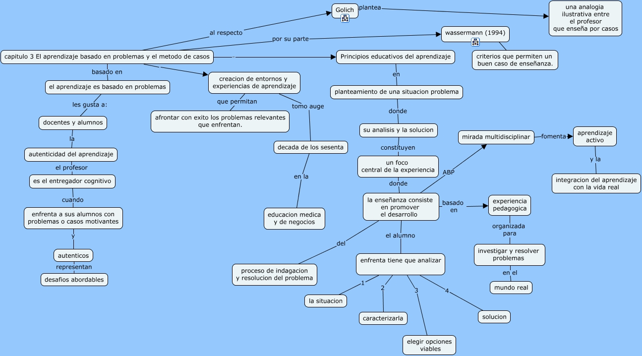Este Cmap, tiene información relacionada con: capitulo 3, enfrenta tiene que analizar 1 la situacion, experiencia pedagogica organizada para investigar y resolver problemas, autenticos representan desafios abordables, enfrenta a sus alumnos con problemas o casos motivantes y autenticos, creacion de entornos y experiencias de aprendizaje tomo auge decada de los sesenta, capitulo 3 El aprendizaje basado en problemas y el metodo de casos al respecto Golich, un foco central de la experiencia donde la enseñanza consiste en promover el desarrollo, autenticidad del aprendizaje el profesor es el entregador cognitivo, la enseñanza consiste en promover el desarrollo ABP mirada multidisciplinar, capitulo 3 El aprendizaje basado en problemas y el metodo de casos . Principios educativos del aprendizaje, capitulo 3 El aprendizaje basado en problemas y el metodo de casos creacion de entornos y experiencias de aprendizaje, capitulo 3 El aprendizaje basado en problemas y el metodo de casos por su parte wassermann (1994), creacion de entornos y experiencias de aprendizaje que permitan afrontar con exito los problemas relevantes que enfrentan., enfrenta tiene que analizar 2 caracterizarla, es el entregador cognitivo cuando enfrenta a sus alumnos con problemas o casos motivantes, mirada multidisciplinar fomenta aprendizaje activo, investigar y resolver problemas en el mundo real, aprendizaje activo y la integracion del aprendizaje con la vida real, la enseñanza consiste en promover el desarrollo el alumno enfrenta tiene que analizar, decada de los sesenta en la educacion medica y de negocios