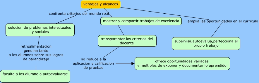 Este Cmap, tiene información relacionada con: capitulo 5.1, ventajas y alcances confronta criterios del mundo real solucion de problemas intelectuales y sociales, ventajas y alcances amplia las oportunidades en el curriculo supervisa,autoevalua,perfecciona el propio trabajo, ventajas y alcances ???? transparentar los criterios del docente, transparentar los criterios del docente no reduce a la aplicacion y calificacion de pruebas ofrece oportunidades variadas y multiples de exponer y documentar lo aprendido, solucion de problemas intelectuales y sociales retroalimentacion genuina tanto a los alumnos sobre sus logros de parendizaje faculta a los alumno a autoevaluarse