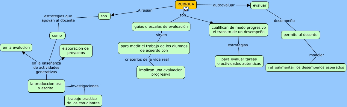 Este Cmap, tiene información relacionada con: 5,2, evaluar desempeño permite al docente, RUBRICA autoevaluar evaluar, RUBRICA Airasian son, como en la enseñanza de actividades generativas la produccion oral y escrita, para medir el trabajo de los alumnos de acuerdo con crieterios de la vida real implican una evaluacion progresiva, la produccion oral y escrita investigaciones trabajo practico de los estudiantes, cualifican de modo progresivo el transito de un desempeño estrategias para evaluar tareas o actividades autenticas, como en la enseñanza de actividades generativas elaboracion de proyectos, guias o escalas de evaluación sirven para medir el trabajo de los alumnos de acuerdo con, RUBRICA son guias o escalas de evaluación, son estrategias que apoyan al docente como, permite al docente modelar retroalimentar los desempeños esperados, RUBRICA son cualifican de modo progresivo el transito de un desempeño, como en la enseñanza de actividades generativas en la evalucion