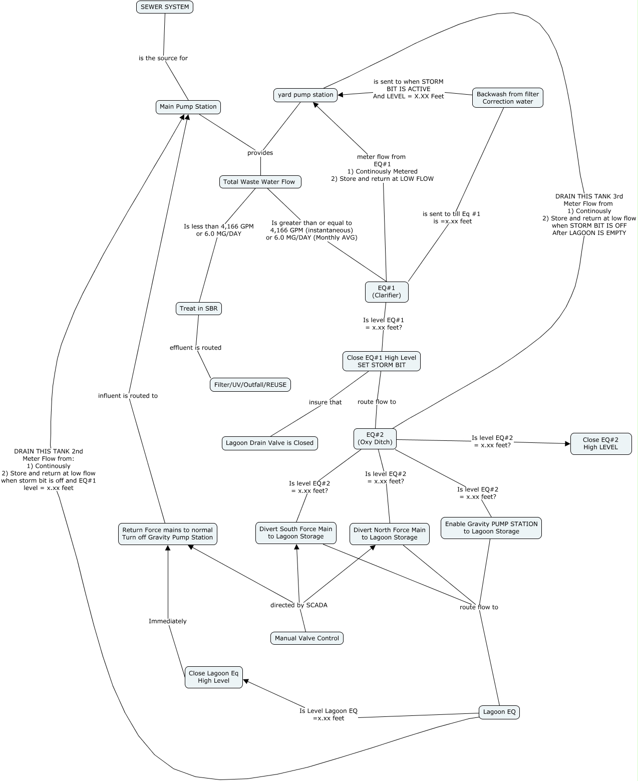 This Concept Map, created with IHMC CmapTools, has information related to: EQ Fill Management, Manual Valve Control directed by SCADA Return Force mains to normal Turn off Gravity Pump Station, Close EQ#1 High Level SET STORM BIT insure that Lagoon Drain Valve is Closed, Lagoon EQ DRAIN THIS TANK 2nd Meter Flow from: 1) Continously 2) Store and return at low flow when storm bit is off and EQ#1 level = x.xx feet Main Pump Station, Divert North Force Main to Lagoon Storage route flow to Lagoon EQ, EQ#2 (Oxy Ditch) Is level EQ#2 = x.xx feet? Divert North Force Main to Lagoon Storage, Treat in SBR effluent is routed Filter/UV/Outfall/REUSE, EQ#1 (Clarifier) meter flow from EQ#1 1) Continously Metered 2) Store and return at LOW FLOW yard pump station, Manual Valve Control directed by SCADA Divert North Force Main to Lagoon Storage, Total Waste Water Flow Is greater than or equal to 4,166 GPM (instantaneous) or 6.0 MG/DAY (Monthly AVG) EQ#1 (Clarifier), Main Pump Station provides Total Waste Water Flow, yard pump station provides Total Waste Water Flow, EQ#2 (Oxy Ditch) DRAIN THIS TANK 3rd Meter Flow from 1) Continously 2) Store and return at low flow when STORM BIT IS OFF After LAGOON IS EMPTY yard pump station, Return Force mains to normal Turn off Gravity Pump Station influent is routed to Main Pump Station, EQ#2 (Oxy Ditch) Is level EQ#2 = x.xx feet? Divert South Force Main to Lagoon Storage, SEWER SYSTEM is the source for Main Pump Station, EQ#2 (Oxy Ditch) Is level EQ#2 = x.xx feet? Close EQ#2 High LEVEL, Divert South Force Main to Lagoon Storage route flow to Lagoon EQ, Enable Gravity PUMP STATION to Lagoon Storage route flow to Lagoon EQ, Close Lagoon Eq High Level Immediately Return Force mains to normal Turn off Gravity Pump Station, EQ#1 (Clarifier) Is level EQ#1 = x.xx feet? Close EQ#1 High Level SET STORM BIT
