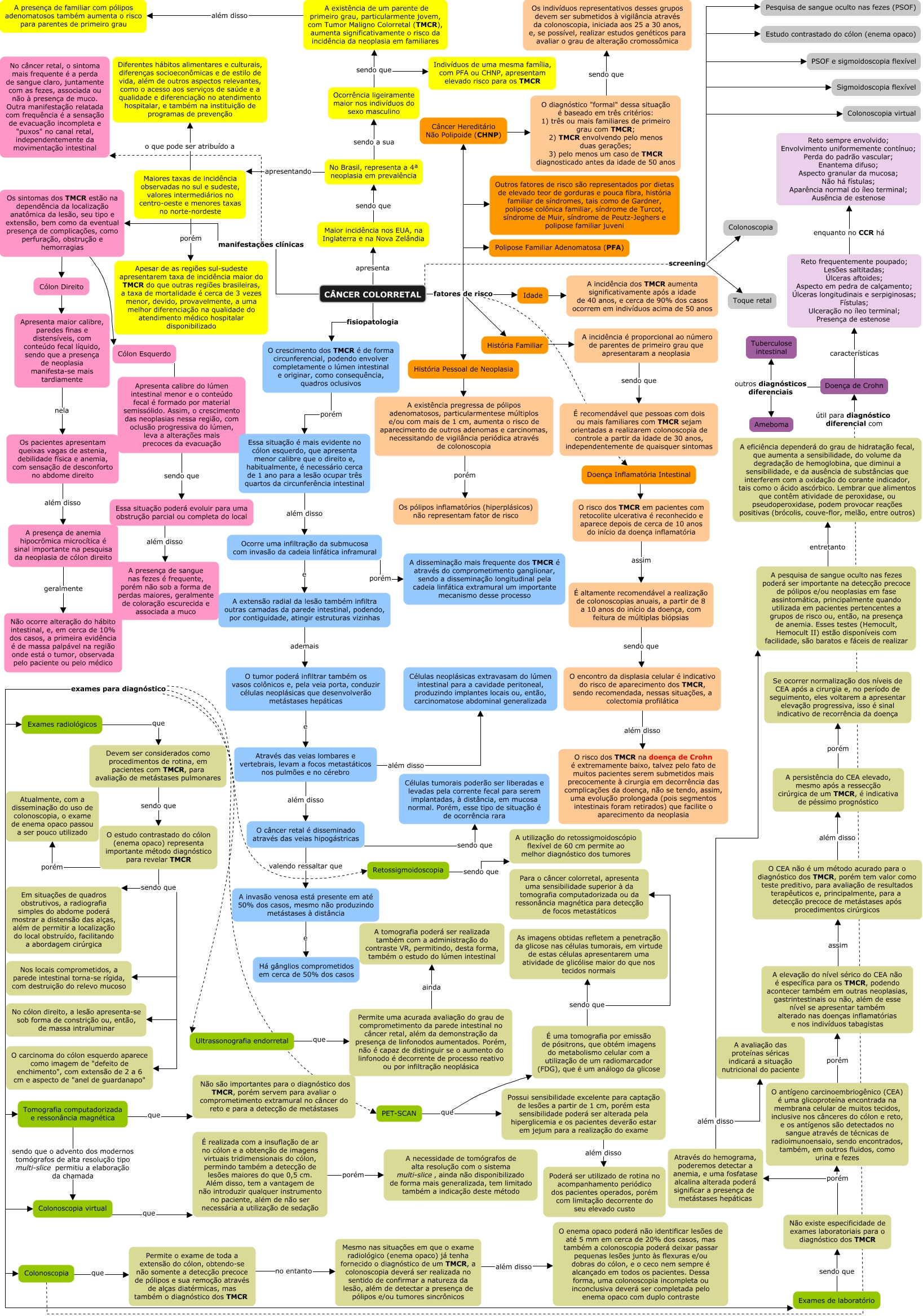 Esse mapa conceitual, produzido no IHMC CmapTools, tem a informação relacionada a: Câncer Colorretal, A existência de um parente de primeiro grau, particularmente jovem, com Tumor Maligno Colorretal (TMCR), aumenta significativamente o risco da incidência da neoplasia em familiares além disso A presença de familiar com pólipos adenomatosos também aumenta o risco para parentes de primeiro grau, O estudo contrastado do cólon (enema opaco) representa importante método diagnóstico para revelar TMCR sendo que Nos locais comprometidos, a parede intestinal torna-se rígida, com destruição do relevo mucoso, Idade ???? A incidência dos TMCR aumenta significativamente após a idade de 40 anos, e cerca de 90% dos casos ocorrem em indivíduos acima de 50 anos, CÂNCER COLORRETAL exames para diagnóstico Ultrassonografia endorretal, O estudo contrastado do cólon (enema opaco) representa importante método diagnóstico para revelar TMCR sendo que No cólon direito, a lesão apresenta-se sob forma de constrição ou, então, de massa intraluminar, CÂNCER COLORRETAL fatores de risco Câncer Hereditário Não Polipoide (CHNP), Através do hemograma, poderemos detectar a anemia, e uma fosfatase alcalina alterada poderá significar a presença de metástases hepáticas além disso A avaliação das proteínas séricas indicará a situação nutricional do paciente, Doença de Crohn características Reto frequentemente poupado; Lesões saltitadas; Úlceras aftoides; Aspecto em pedra de calçamento; Úlceras longitudinais e serpiginosas; Fístulas; Ulceração no íleo terminal; Presença de estenose, Os sintomas dos TMCR estão na dependência da localização anatômica da lesão, seu tipo e extensão, bem como da eventual presença de complicações, como perfuração, obstrução e hemorragias ???? Cólon Esquerdo, Reto frequentemente poupado; Lesões saltitadas; Úlceras aftoides; Aspecto em pedra de calçamento; Úlceras longitudinais e serpiginosas; Fístulas; Ulceração no íleo terminal; Presença de estenose enquanto no CCR há Reto sempre envolvido; Envolvimento uniformemente contínuo; Perda do padrão vascular; Enantema difuso; Aspecto granular da mucosa; Não há fístulas; Aparência normal do íleo terminal; Ausência de estenose, Os sintomas dos TMCR estão na dependência da localização anatômica da lesão, seu tipo e extensão, bem como da eventual presença de complicações, como perfuração, obstrução e hemorragias ???? Cólon Direito, O CEA não é um método acurado para o diagnóstico dos TMCR, porém tem valor como teste preditivo, para avaliação de resultados terapêuticos e, principalmente, para a detecção precoce de metástases após procedimentos cirúrgicos além disso A persistência do CEA elevado, mesmo após a ressecção cirúrgica de um TMCR, é indicativa de péssimo prognóstico, CÂNCER COLORRETAL exames para diagnóstico Exames radiológicos, CÂNCER COLORRETAL screening Pesquisa de sangue oculto nas fezes (PSOF), Maiores taxas de incidência observadas no sul e sudeste, valores intermediários no centro-oeste e menores taxas no norte-nordeste porém Apesar de as regiões sul-sudeste apresentarem taxa de incidência maior do TMCR do que outras regiões brasileiras, a taxa de mortalidade é cerca de 3 vezes menor, devido, provavelmente, a uma melhor diferenciação na qualidade do atendimento médico hospitalar disponibilizado, O câncer retal é disseminado através das veias hipogástricas valendo ressaltar que A invasão venosa está presente em até 50% dos casos, mesmo não produzindo metástases à distância, CÂNCER COLORRETAL fatores de risco História Pessoal de Neoplasia, O antígeno carcinoembriogênico (CEA) é uma glicoproteína encontrada na membrana celular de muitos tecidos, inclusive nos cânceres do cólon e reto, e os antígenos são detectados no sangue através de técnicas de radioimunoensaio, sendo encontrados, também, em outros fluidos, como urina e fezes porém A elevação do nível sérico do CEA não é específica para os TMCR, podendo acontecer também em outras neoplasias, gastrintestinais ou não, além de esse nível se apresentar também alterado nas doenças inflamatórias e nos indivíduos tabagistas, Maior incidência nos EUA, na Inglaterra e na Nova Zelândia sendo que No Brasil, representa a 4ª neoplasia em prevalência, O estudo contrastado do cólon (enema opaco) representa importante método diagnóstico para revelar TMCR porém Atualmente, com a disseminação do uso de colonoscopia, o exame de enema opaco passou a ser pouco utilizado