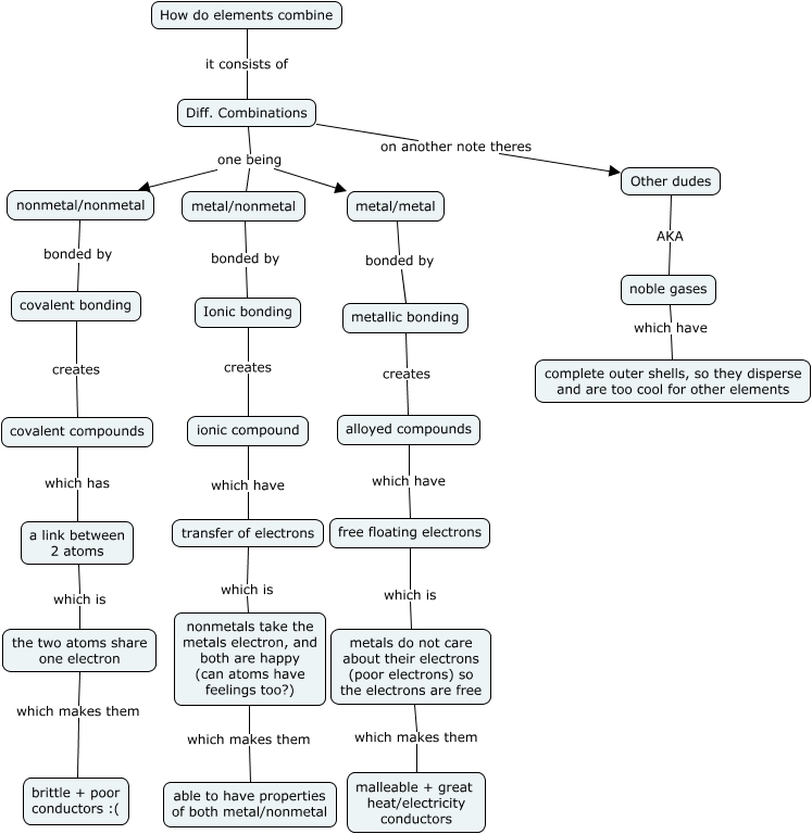 This Concept Map, created with IHMC CmapTools, has information related to: Element Combos!, covalent compounds which has a link between 2 atoms, Diff. Combinations one being metal/nonmetal, Ionic bonding creates ionic compound, Other dudes AKA noble gases, ionic compound which have transfer of electrons, metallic bonding creates alloyed compounds, Diff. Combinations on another note theres Other dudes, alloyed compounds which have free floating electrons, metal/nonmetal bonded by Ionic bonding, Diff. Combinations one being metal/metal, noble gases which have complete outer shells, so they disperse and are too cool for other elements, the two atoms share one electron which makes them brittle + poor conductors :(, metals do not care about their electrons (poor electrons) so the electrons are free which makes them malleable + great heat/electricity conductors, free floating electrons which is metals do not care about their electrons (poor electrons) so the electrons are free, transfer of electrons which is nonmetals take the metals electron, and both are happy (can atoms have feelings too?), covalent bonding creates covalent compounds, How do elements combine it consists of Diff. Combinations, a link between 2 atoms which is the two atoms share one electron, nonmetal/nonmetal bonded by covalent bonding, Diff. Combinations one being nonmetal/nonmetal