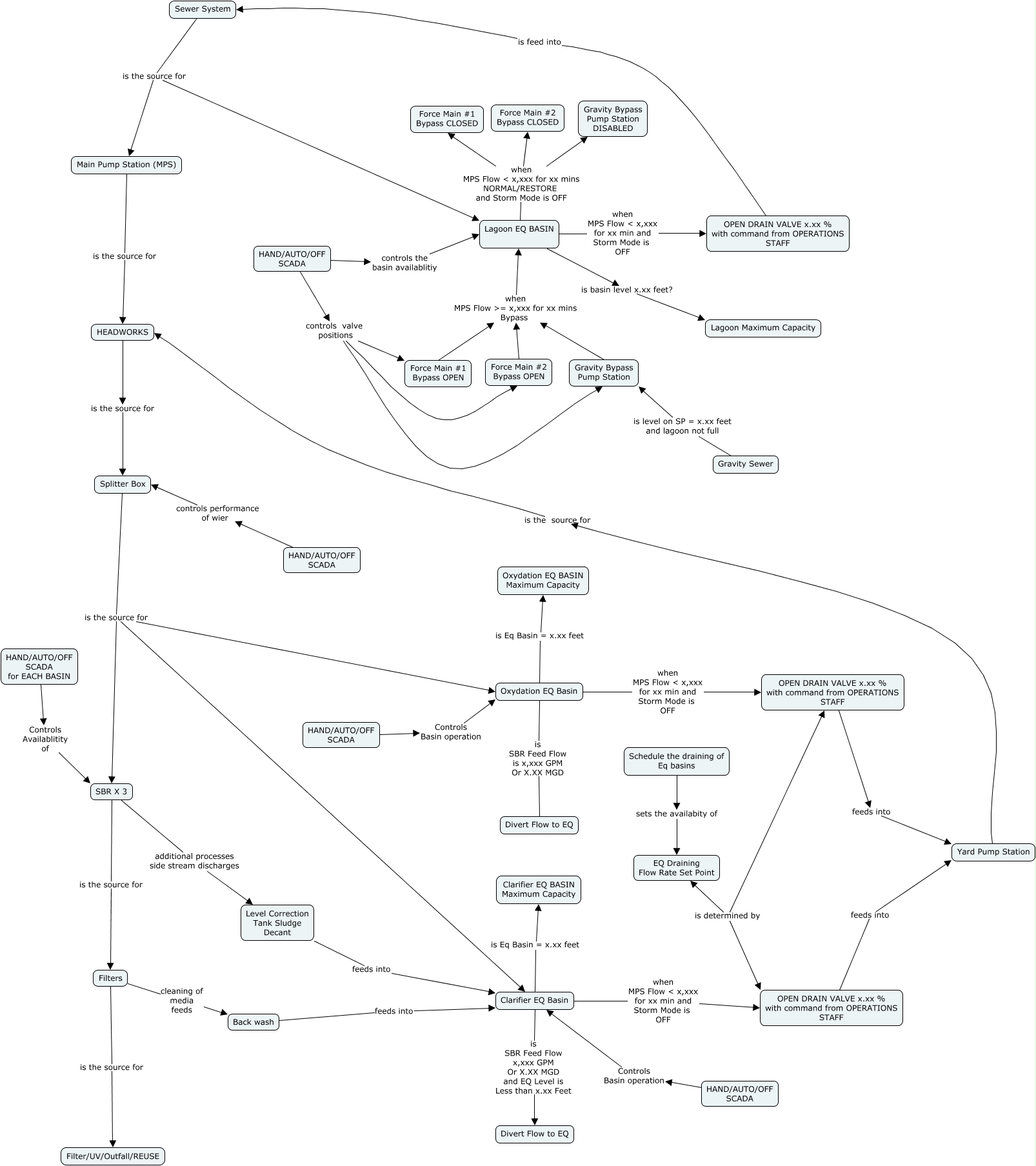 This Concept Map, created with IHMC CmapTools, has information related to: Wolf Creek Flow Management Version 2, Lagoon EQ BASIN when MPS Flow < x,xxx for xx min and Storm Mode is OFF OPEN DRAIN VALVE x.xx % with command from OPERATIONS STAFF, OPEN DRAIN VALVE x.xx % with command from OPERATIONS STAFF is feed into Sewer System, Lagoon EQ BASIN when MPS Flow < x,xxx for xx mins NORMAL/RESTORE and Storm Mode is OFF Gravity Bypass Pump Station DISABLED, Lagoon EQ BASIN when MPS Flow < x,xxx for xx mins NORMAL/RESTORE and Storm Mode is OFF Force Main #1 Bypass CLOSED, HAND/AUTO/OFF SCADA controls valve positions Gravity Bypass Pump Station, Back wash feeds into Clarifier EQ Basin, Lagoon EQ BASIN when MPS Flow < x,xxx for xx mins NORMAL/RESTORE and Storm Mode is OFF Force Main #2 Bypass CLOSED, Oxydation EQ Basin when MPS Flow < x,xxx for xx min and Storm Mode is OFF OPEN DRAIN VALVE x.xx % with command from OPERATIONS STAFF, Clarifier EQ Basin is SBR Feed Flow x,xxx GPM Or X.XX MGD and EQ Level is Less than x.xx Feet Divert Flow to EQ, HAND/AUTO/OFF SCADA controls the basin availablitiy Lagoon EQ BASIN, Splitter Box is the source for Oxydation EQ Basin, Level Correction Tank Sludge Decant feeds into Clarifier EQ Basin, Main Pump Station (MPS) is the source for HEADWORKS, SBR X 3 is the source for Filters, HAND/AUTO/OFF SCADA Controls Basin operation Clarifier EQ Basin, Clarifier EQ Basin when MPS Flow < x,xxx for xx min and Storm Mode is OFF OPEN DRAIN VALVE x.xx % with command from OPERATIONS STAFF, Filters is the source for Filter/UV/Outfall/REUSE, HAND/AUTO/OFF SCADA Controls Basin operation Oxydation EQ Basin, OPEN DRAIN VALVE x.xx % with command from OPERATIONS STAFF feeds into Yard Pump Station, Clarifier EQ Basin is Eq Basin = x.xx feet Clarifier EQ BASIN Maximum Capacity