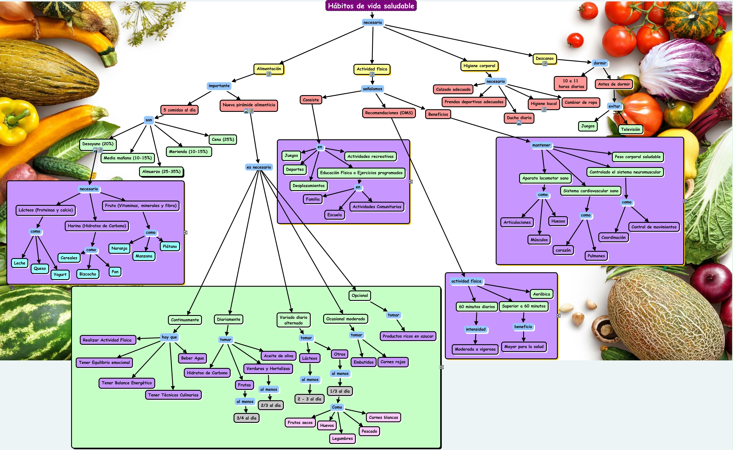 Este Cmap, tiene información relacionada con: Hábitos de vida saludable, Sistema cardiovascular sano como corazón, Sistema cardiovascular sano como Pulmones, Consiste en Educación Física o Ejercicios programados, Continuamente hay que Beber Agua, Fruta (Vitaminas, minerales y fibra) como Naranja, Higiene corporal necesario Cambiar de ropa, Nueva pirámide alimenticia es necesario Variado diario alternado, Consiste en Juegos, Diariamente tomar Frutas, 5 comidas al día son Almuerzo (25-35%), Harina (Hidratos de Carbono) como Bizcocho, Aparato locomotor sano como Huesos, Desayuno (20%) necesario Fruta (Vitaminas, minerales y fibra), Hábitos de vida saludable necesaria Actividad física, Ocasional moderado tomar Embutidos, 60 minutos diarios intensidad Moderada a vigorosa, Desayuno (20%) necesario Harina (Hidratos de Carbono), Frutas al menos 3/4 al día, Hábitos de vida saludable necesaria Alimentación, 5 comidas al día son Merienda (10-15%)
