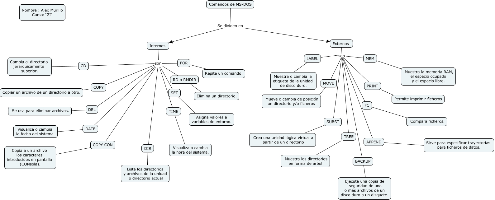 Este Cmap, tiene información relacionada con: comandos, MEM son FC, COPY son DIR, LABEL son FC, MEM son SUBST, LABEL son MOVE, CD son DATE, DEL ???? Se usa para eliminar archivos., DATE ???? Visualiza o cambia la fecha del sistema., LABEL son PRINT, Internos son RD o RMDIR, COPY son TIME, Externos son APPEND, MEM son PRINT, RD o RMDIR ???? Elimina un directorio., COPY son SET, MEM ???? Muestra la memoria RAM, el espacio ocupado y el espacio libre., CD son COPY CON, LABEL son BACKUP, MEM son APPEND, CD ???? Cambia al directorio jerárquicamente superior.