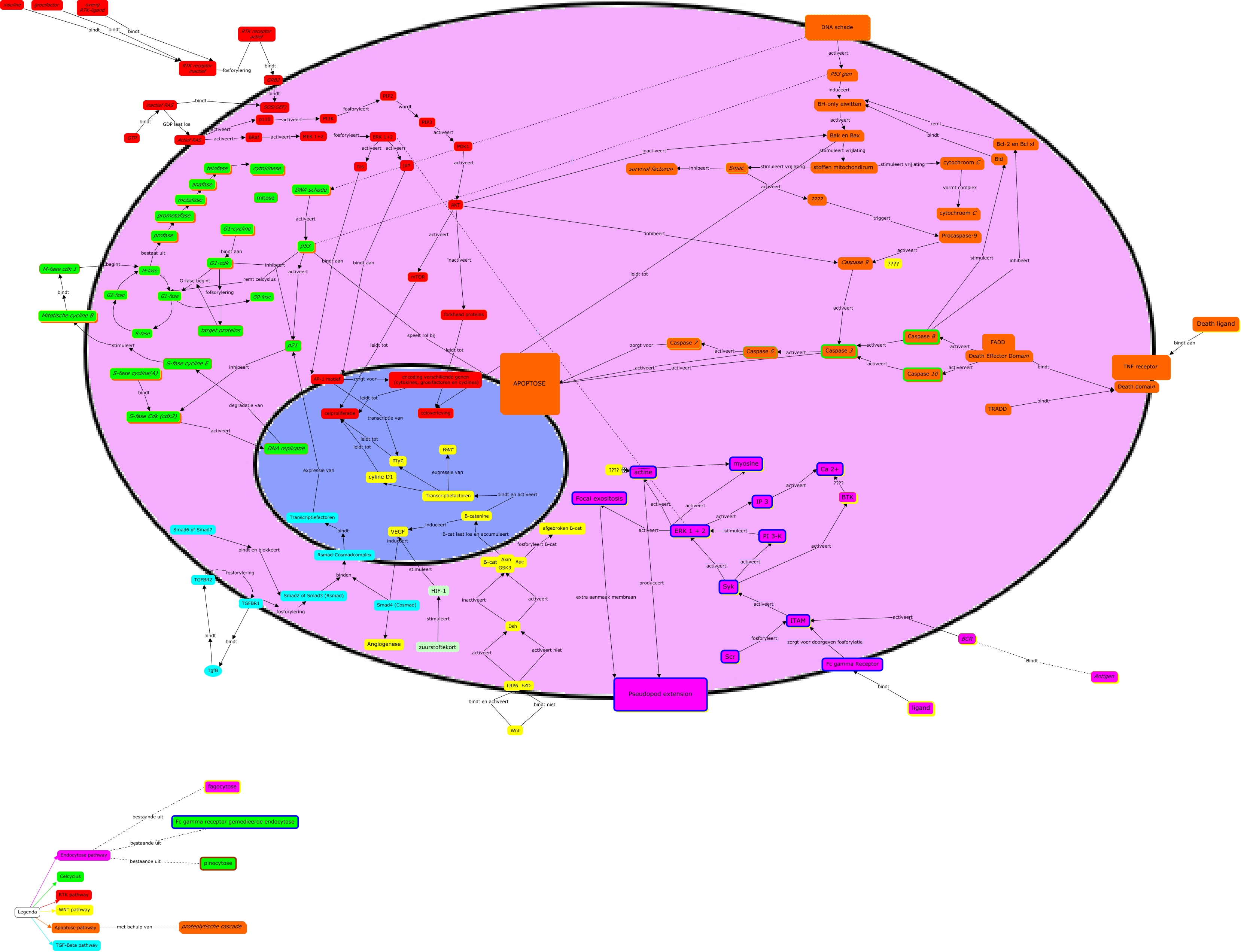 Deze Concept Map heeft informatie gerelateerd aan: hjbjknk, Syk activeert PI 3-K, GRB2 bindt SOS(GEF), PDK1 activeert AKT, ERK 1 + 2 activeert IP 3, ERK 1+2 activeert fos, ???? triggert Procaspase-9, PIP2 wordt PIP3, target proteins G-fase begint G1-fase, TRADD bindt Death domain, p21 inhibeert S-fase Cdk (cdk2), BRaf activeert MEK 1+2, Transcriptiefactoren expressie van WNT, Bcl-2 en Bcl xl remt BH-only eiwitten, Smac inhibeert survival factoren, Legenda Endocytose pathway, stoffen mitochondirum stimuleert vrijlating Smac, P53 gen induceert BH-only eiwitten, Legenda WNT pathway, p53 activeert p21, telofase cytokinese
