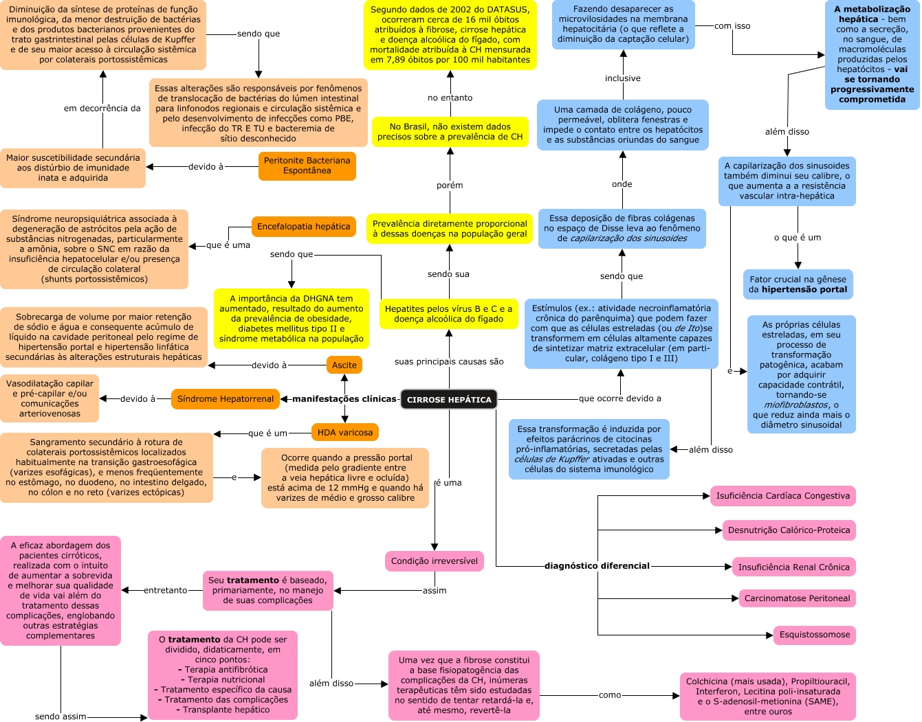 Esse mapa conceitual, produzido no IHMC CmapTools, tem a informação relacionada a: Cirrose Hepática - 3° caso, CIRROSE HEPÁTICA diagnóstico diferencial Isuficiência Cardíaca Congestiva, Prevalência diretamente proporcional à dessas doenças na população geral porém No Brasil, não existem dados precisos sobre a prevalência de CH, No Brasil, não existem dados precisos sobre a prevalência de CH no entanto Segundo dados de 2002 do DATASUS, ocorreram cerca de 16 mil óbitos atribuídos à fibrose, cirrose hepática e doença alcoólica do fígado, com mortalidade atribuída à CH mensurada em 7,89 óbitos por 100 mil habitantes, Encefalopatia hepática que é uma Síndrome neuropsiquiátrica associada à degeneração de astrócitos pela ação de substâncias nitrogenadas, particularmente a amônia, sobre o SNC em razão da insuficiência hepatocelular e/ou presença de circulação colateral (shunts portossistêmicos), A capilarização dos sinusoides também diminui seu calibre, o que aumenta a a resistência vascular intra-hepática e As próprias células estreladas, em seu processo de transformação patogênica, acabam por adquirir capacidade contrátil, tornando-se miofibroblastos, o que reduz ainda mais o diâmetro sinusoidal, Hepatites pelos vírus B e C e a doença alcoólica do fígado sendo sua Prevalência diretamente proporcional à dessas doenças na população geral, CIRROSE HEPÁTICA é uma Condição irreversível, CIRROSE HEPÁTICA diagnóstico diferencial Desnutrição Calórico-Proteica, Síndrome Hepatorrenal devido à Vasodilatação capilar e pré-capilar e/ou comunicações arteriovenosas, A metabolização hepática - bem como a secreção, no sangue, de macromoléculas produzidas pelos hepatócitos - vai se tornando progressivamente comprometida além disso A capilarização dos sinusoides também diminui seu calibre, o que aumenta a a resistência vascular intra-hepática, CIRROSE HEPÁTICA diagnóstico diferencial Insuficiência Renal Crônica, Peritonite Bacteriana Espontânea devido à Maior suscetibilidade secundária aos distúrbio de imunidade inata e adquirida, Estímulos (ex.: atividade necroinflamatória crônica do parênquima) que podem fazer com que as células estreladas (ou de Ito)se transformem em células altamente capazes de sintetizar matriz extracelular (em parti- cular, colágeno tipo I e III) sendo que Essa deposição de fibras colágenas no espaço de Disse leva ao fenômeno de capilarização dos sinusoides, Maior suscetibilidade secundária aos distúrbio de imunidade inata e adquirida em decorrência da Diminuição da síntese de proteínas de função imunológica, da menor destruição de bactérias e dos produtos bacterianos provenientes do trato gastrintestinal pelas células de Kupffer e de seu maior acesso à circulação sistêmica por colaterais portossistêmicas, CIRROSE HEPÁTICA suas principais causas são Hepatites pelos vírus B e C e a doença alcoólica do fígado, Seu tratamento é baseado, primariamente, no manejo de suas complicações além disso Uma vez que a fibrose constitui a base fisiopatogência das complicações da CH, inúmeras terapêuticas têm sido estudadas no sentido de tentar retardá-la e, até mesmo, revertê-la, CIRROSE HEPÁTICA diagnóstico diferencial Esquistossomose, Estímulos (ex.: atividade necroinflamatória crônica do parênquima) que podem fazer com que as células estreladas (ou de Ito)se transformem em células altamente capazes de sintetizar matriz extracelular (em parti- cular, colágeno tipo I e III) além disso Essa transformação é induzida por efeitos parácrinos de citocinas pró-inflamatórias, secretadas pelas células de Kupffer ativadas e outras células do sistema imunológico, Ascite devido à Sobrecarga de volume por maior retenção de sódio e água e consequente acúmulo de líquido na cavidade peritoneal pelo regime de hipertensão portal e hipertensão linfática secundárias às alterações estruturais hepáticas, Essa deposição de fibras colágenas no espaço de Disse leva ao fenômeno de capilarização dos sinusoides onde Uma camada de colágeno, pouco permeável, oblitera fenestras e impede o contato entre os hepatócitos e as substâncias oriundas do sangue