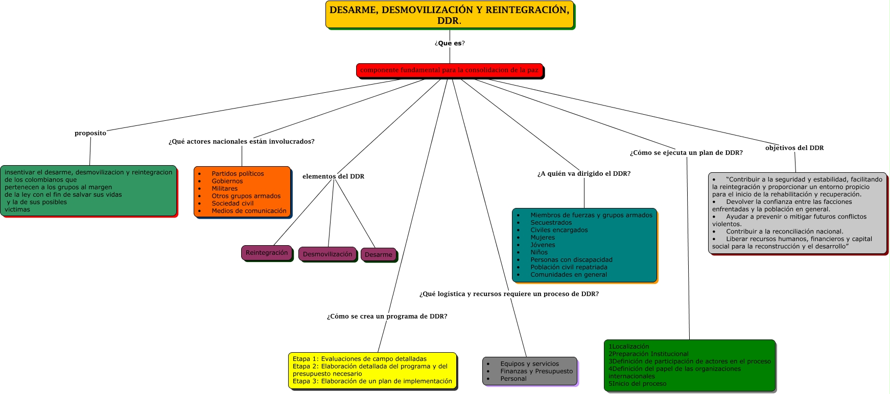 Este Cmap, tiene información relacionada con: MAPA CONCEPTUAL, componente fundamental para la consolidacion de la paz elementos del DDR Desmovilización, componente fundamental para la consolidacion de la paz elementos del DDR Reintegración, componente fundamental para la consolidacion de la paz proposito insentivar el desarme, desmovilizacion y reintegracion de los colombianos que pertenecen a los grupos al margen de la ley con el fin de salvar sus vidas y la de sus posibles victimas, componente fundamental para la consolidacion de la paz ¿Qué logística y recursos requiere un proceso de DDR? • Equipos y servicios • Finanzas y Presupuesto • Personal, componente fundamental para la consolidacion de la paz ¿A quién va dirigido el DDR? • Miembros de fuerzas y grupos armados • Secuestrados • Civiles encargados • Mujeres • Jóvenes • Niños • Personas con discapacidad • Población civil repatriada • Comunidades en general, componente fundamental para la consolidacion de la paz ¿Qué actores nacionales están involucrados? • Partidos políticos • Gobiernos • Militares • Otros grupos armados • Sociedad civil • Medios de comunicación, componente fundamental para la consolidacion de la paz elementos del DDR Desarme, componente fundamental para la consolidacion de la paz ¿Cómo se ejecuta un plan de DDR? 1Localización 2Preparación Institucional 3Definición de participación de actores en el proceso 4Definición del papel de las organizaciones internacionales 5Inicio del proceso, DESARME, DESMOVILIZACIÓN Y REINTEGRACIÓN, DDR. ¿Que es? componente fundamental para la consolidacion de la paz, componente fundamental para la consolidacion de la paz objetivos del DDR • “Contribuir a la seguridad y estabilidad, facilitando la reintegración y proporcionar un entorno propicio para el inicio de la rehabilitación y recuperación. • Devolver la confianza entre las facciones enfrentadas y la población en general. • Ayudar a prevenir o mitigar futuros conflictos violentos. • Contribuir a la reconciliación nacional. • Liberar recursos humanos, financieros y capital social para la reconstrucción y el desarrollo”, componente fundamental para la consolidacion de la paz ¿Cómo se crea un programa de DDR? Etapa 1: Evaluaciones de campo detalladas Etapa 2: Elaboración detallada del programa y del presupuesto necesario Etapa 3: Elaboración de un plan de implementación