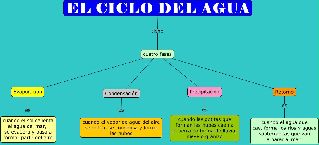 Este Cmap, tiene información relacionada con: El ciclo del agua, cuatro fases Condensación, Retorno es cuando el agua que cae, forma los ríos y aguas subterraneas que van a parar al mar, cuatro fases Evaporación, cuatro fases Precipitación, Condensación es cuando el vapor de agua del aire se enfría, se condensa y forma las nubes, Precipitación es cuando las gotitas que forman las nubes caen a la tierra en forma de lluvia, nieve o granizo, Evaporación es cuando el sol calienta el agua del mar, se evapora y pasa a formar parte del aire, cuatro fases Retorno, EL CICLO DEL AGUA tiene cuatro fases