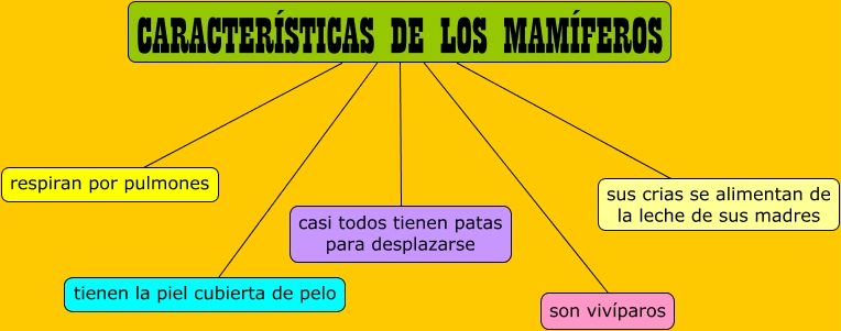 Este Cmap, tiene información relacionada con: Características de los mamíferos, CARACTERÍSTICAS DE LOS MAMÍFEROS respiran por pulmones, CARACTERÍSTICAS DE LOS MAMÍFEROS son vivíparos, CARACTERÍSTICAS DE LOS MAMÍFEROS sus crias se alimentan de la leche de sus madres, CARACTERÍSTICAS DE LOS MAMÍFEROS casi todos tienen patas para desplazarse, CARACTERÍSTICAS DE LOS MAMÍFEROS tienen la piel cubierta de pelo