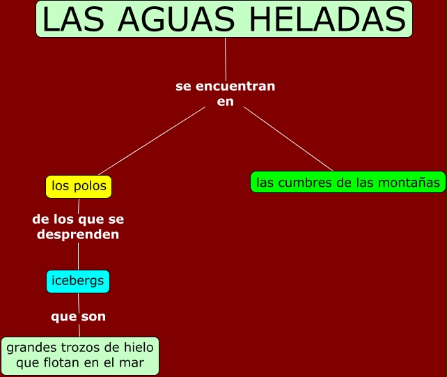 Este Cmap, tiene información relacionada con: Las aguas heladas, icebergs que son grandes trozos de hielo que flotan en el mar, LAS AGUAS HELADAS se encuentran en los polos, los polos de los que se desprenden icebergs, LAS AGUAS HELADAS se encuentran en las cumbres de las montañas